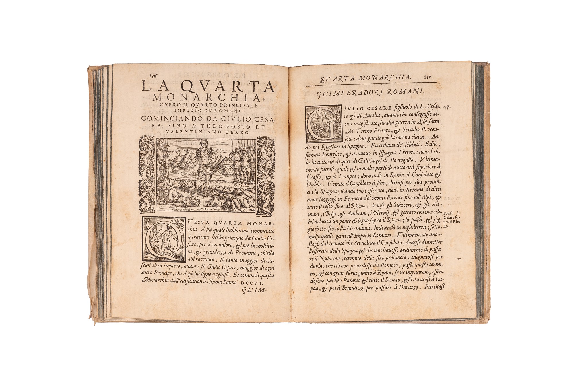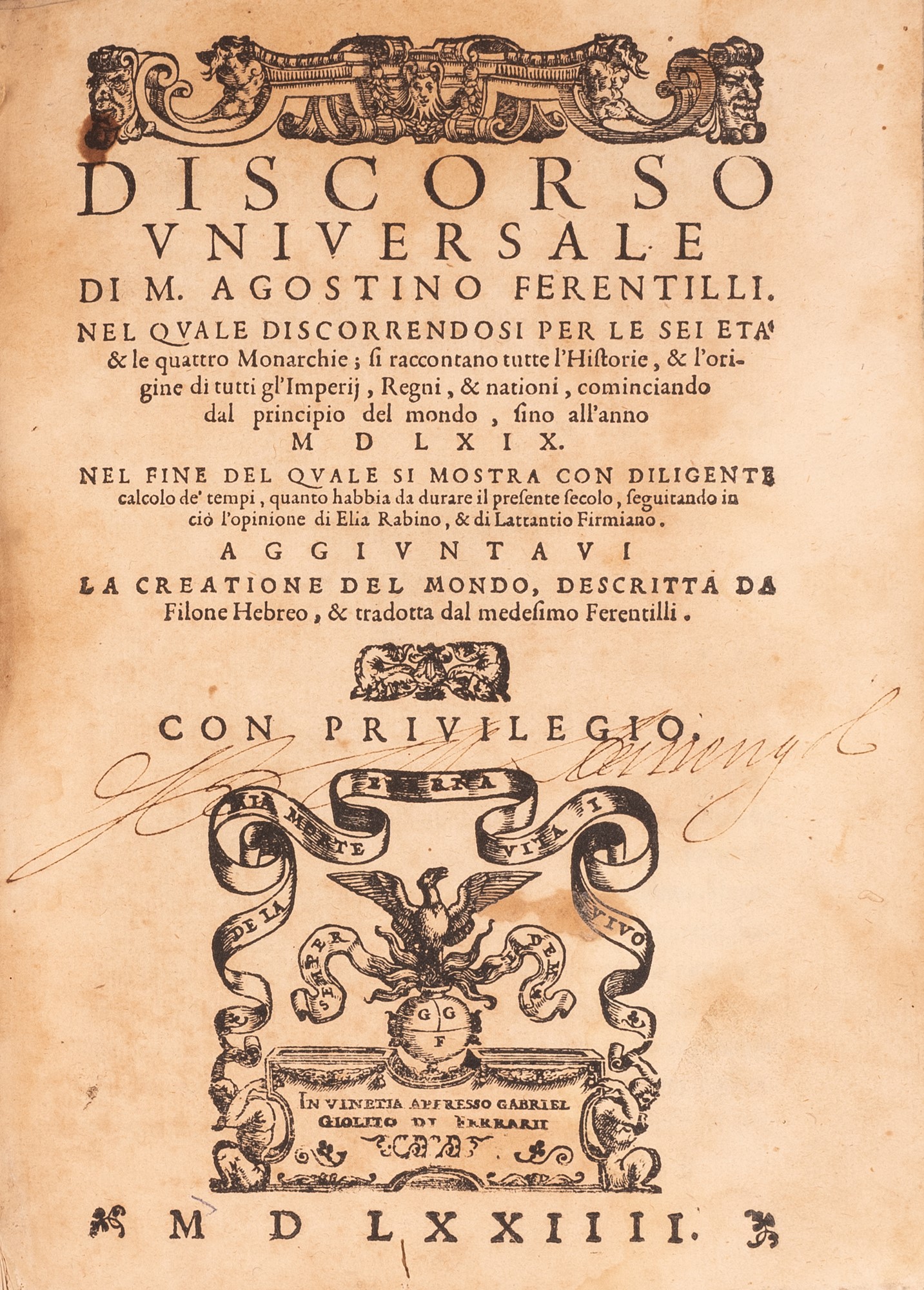 in 8°, pp. VIII+231+28 carte che finiscono con la creazione del mondo.Pergamena coeva con piccola mancanza al dorso. 10 vignette xilografica all'inizio di ogni capitolo. tracce di tarlo che interessano dalla pagina 223 per 30 pagine. Qualche brunitura. Prima rarissima edizione di quest'opera del Ferentilli, autore poco conosciuto (si sa solo che fu uno storico e poligrafo nato a Terni nel XVI secolo). Vengono descritte le sei età e le quattro monarchie del mondo (ognuna con propria vignetta xilografica): la prima età durò fino al Diluvio, la seconda fino alla natività di Abramo, la terza fino ai tempi di Davide, la quarta fino alla cattività di Babilonia, la quinta fino alla natività di Cristo e la sesta dura "infino al fine, & consumatione di tutti i secoli". La prima monarchia "cominciò ne gli assirii et poi diede luogo a quel de' Persi", la seconda "diede luogo a quello de' greci", la terza "diede luogo a quello de' romani", la quarta durò sino a Teodosio e Valentiniano terzo.