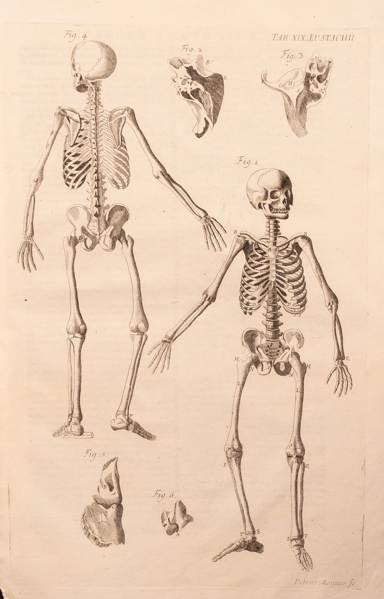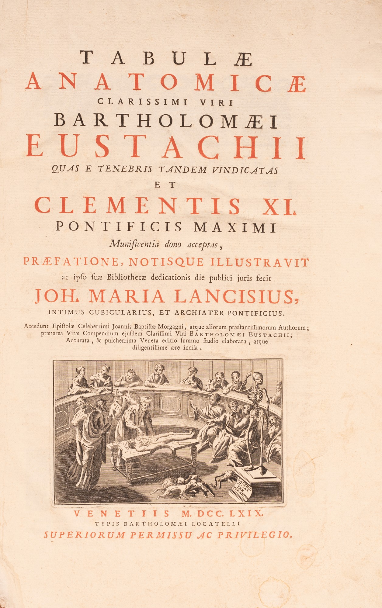 Bartolomeo Eustachio (circa 1510/20-1574) completò le tavole nel 1554. Meno stilizzate di quelle del suo contemporaneo e antagonista Vesalio, le sue illustrazioni anatomiche sono straordinariamente accurate nonostante il suo sostegno alle vecchie teorie galeniche dell'anatomia. Le lastre di rame rimasero inedite durante la sua vita e furono riscoperte da Giovanni Maria Lancisi, il medico pontificio, che le pubblicò con i suoi commentari nel 1714. Le 47 tavole originali di Eustachio sono qui reincise su 21 tavole, uno sforzo reso possibile dal formato molto grande di questa edizione. Choulant-Franck, pagina 202 (che fornisce pochissimi dettagli); Garrison-Morton 391 (l'edizione del 1714, ma la lunga nota è rilevante per questa edizione, e include il seguente commento: "Queste lastre di rame sono più accurate dell'opera di Vesalio. Singer era dell'opinione che se fossero apparsi nel 1552 Eustachio si sarebbe classificato con Vesalio come uno dei fondatori dell'anatomia moderna. Scoprì la tromba di Eustachio, il dotto toracico ... e ha dato la prima descrizione accurata dell'utero»). Provenienza: Dr Milton Roxanas (acquistato da James Tait Goodrich, Englewood, con il suo record di catalogo liberamente inserito).