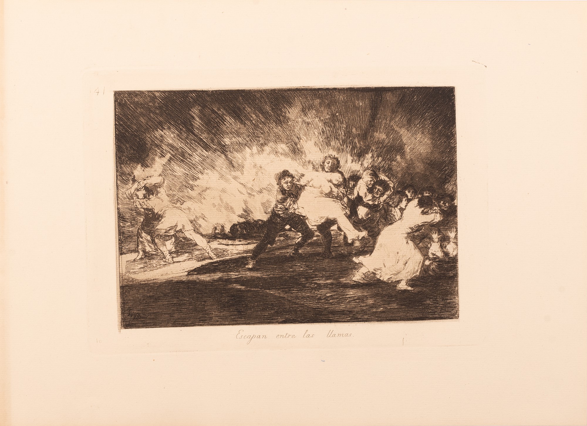In questo foglio una donna viene portata in salvo durante un incendio derivato dalla guerra. Goya non mostra gli eroi militari o popolari che combatterono contro i francesi, piuttosto rappresenta la brutalità, la fame, la disperazione, della distruzione, ma soprattutto della morte. E tutto questo attraverso civili, persone anonime, vere vittime della guerra.