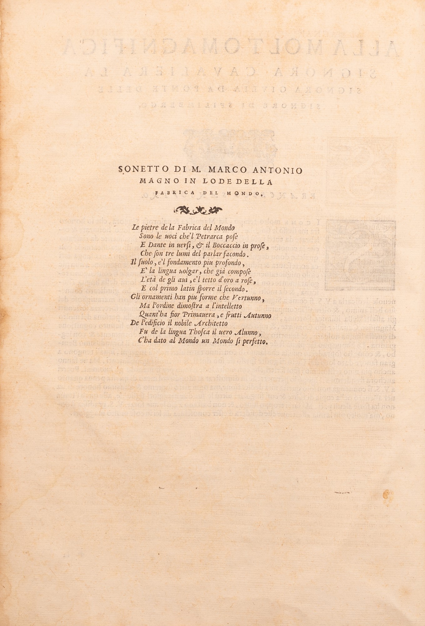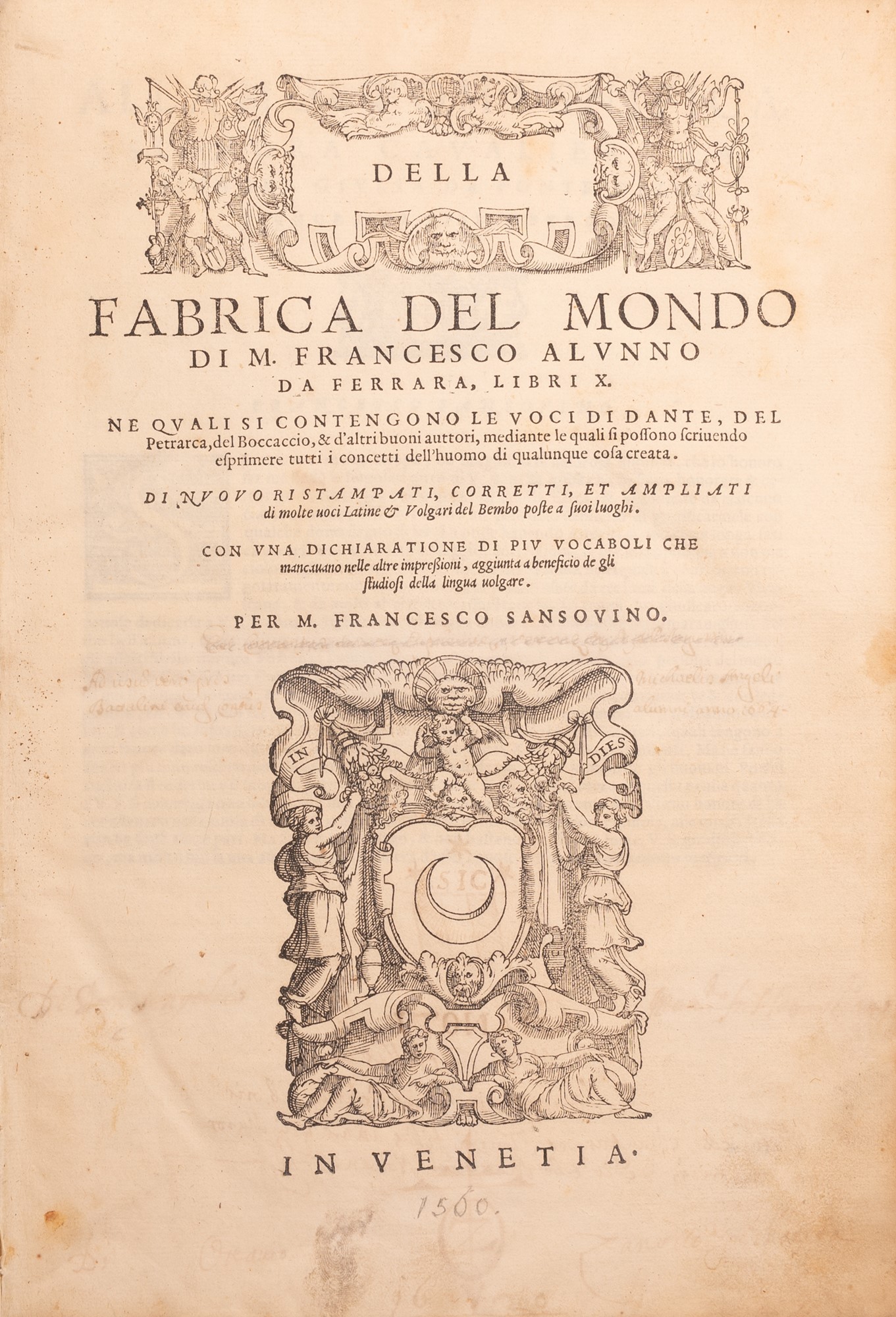 - TITOLO: Della fabrica del mondo di m. Francesco Alunno da Ferrara, libri 10. Ne quali si contengono le voci di Dante, del Petrarca, del Boccaccio, & d'altri buoni auttori, ... di nuouo ristampati, corretti, et ampliati di molti uoci latine & volgari del Bembo poste a suoi luoghi. Con una dichiaratione di piu vocaboli che mancavano nelle altre impressioni, aggiunta a beneficio de gli studiosi della lingua uolgare. Per m. Francesco Sansovino