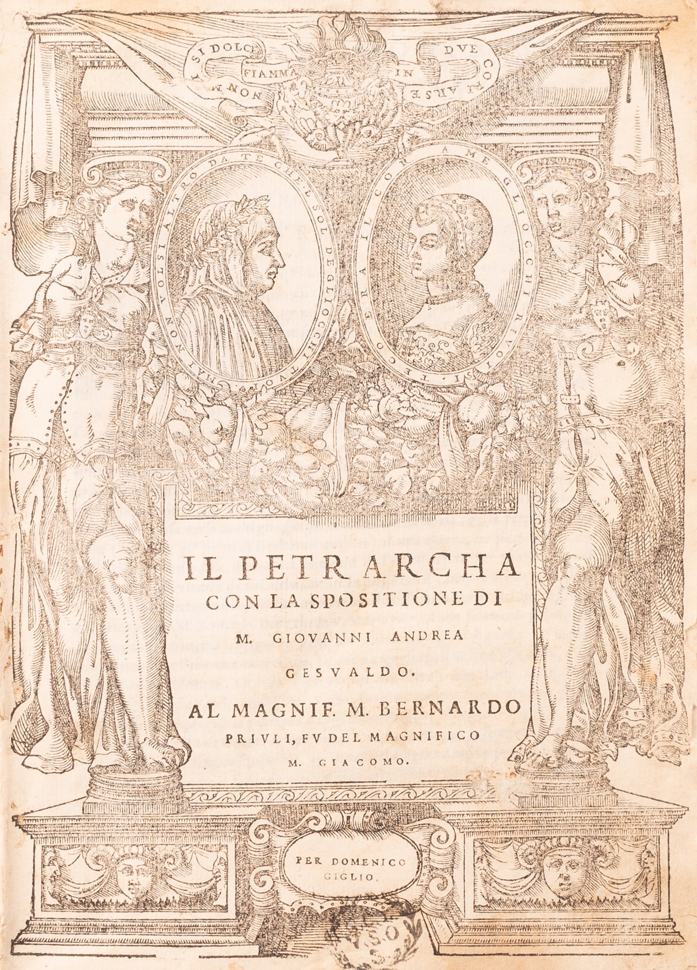 DESCRIZIONE: 4° (cm 15,5 x 22) – 2 parti – carte (22) – 346; (72) – con 2 frontespizi figurati e 6 grandi xilografie ai Trionfi. Solida legatura settecentesca in piena pergamena rigida – titolo manoscritto al dorso e al taglio inferiore – cucitura leggermente allentata in alcuni punti. Antico timbretto di appartenenza al frontespizio – margini sobri (soprattutto quello superiore) – leggero alone giallastro nell’angolo superiore esterno dall’inizio fino a carta 70 e da carta 307 alla 12 dei Trionfi – leggere fioriture sparse - qualche macchiolina qua e là – alcuni fascicoli leggermente allentati – nel complesso. Buon esemplare ben legato. Bella edizione in 4° illustrata del Petrarca.