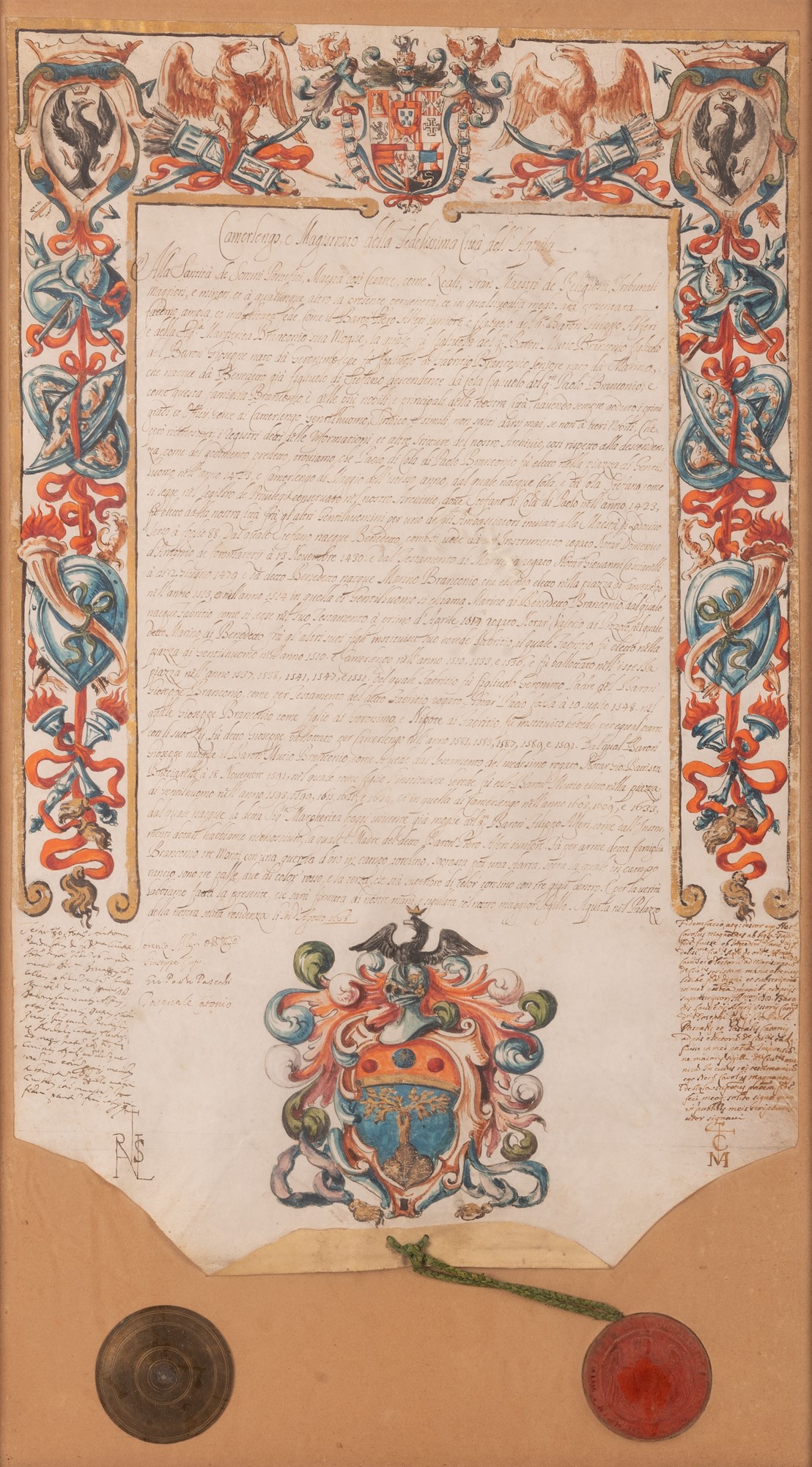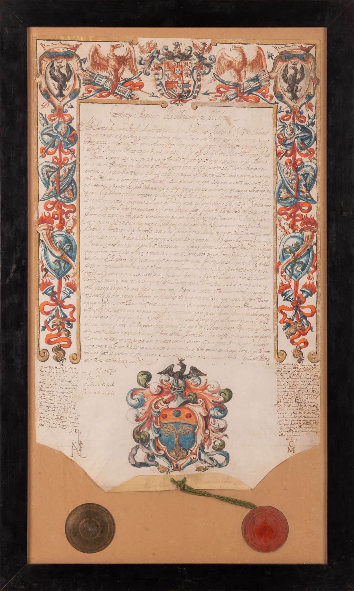 Diploma che attesta la nobiltà del barone Piero Alfieri e della di lui moglie Margherita Branconio in pergamena arricchita da disegni delle armi de' Branconio e stemma della Real Casa Imperiale di Spagna, nonchè di bolla in ceralacca.