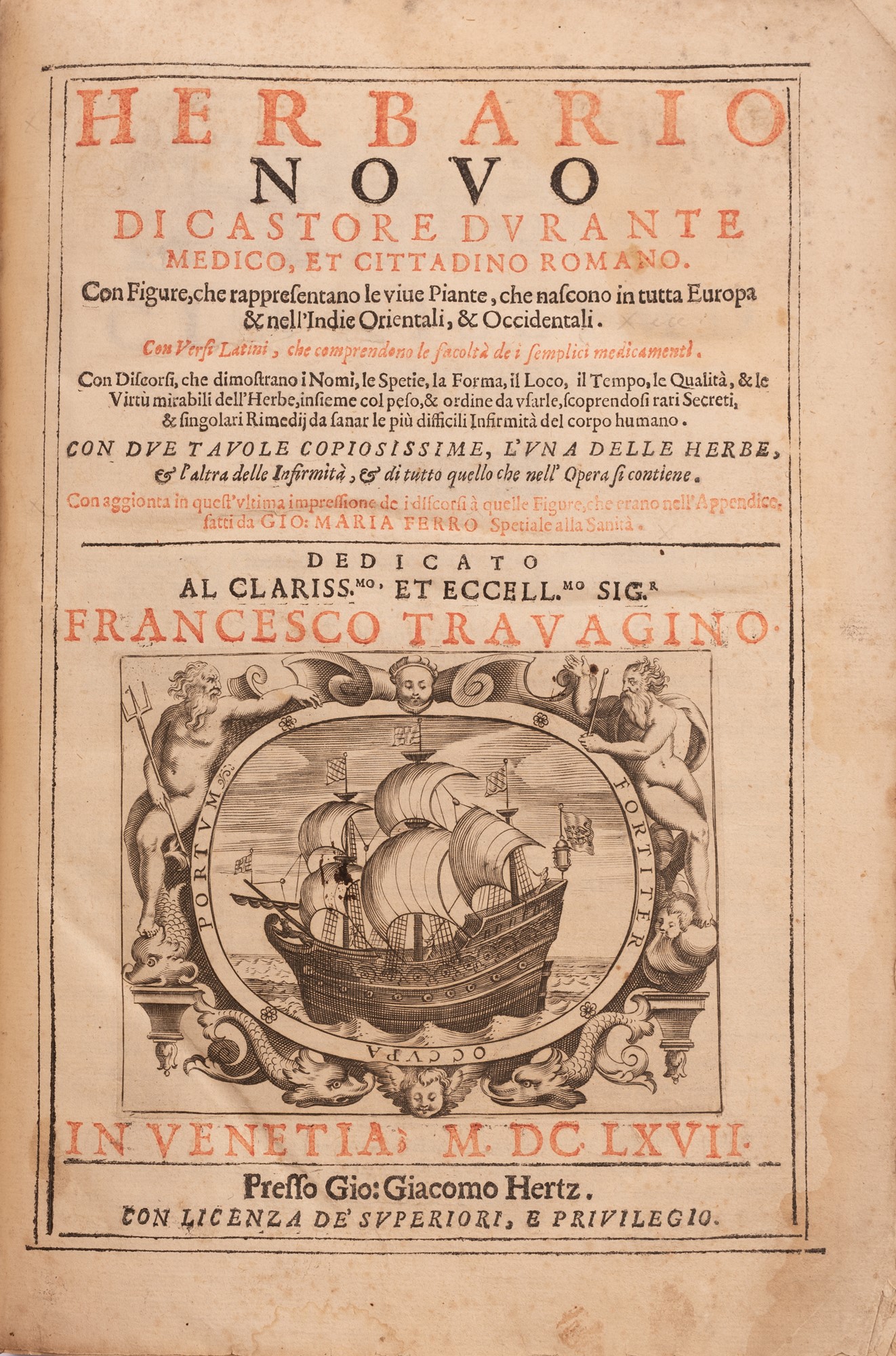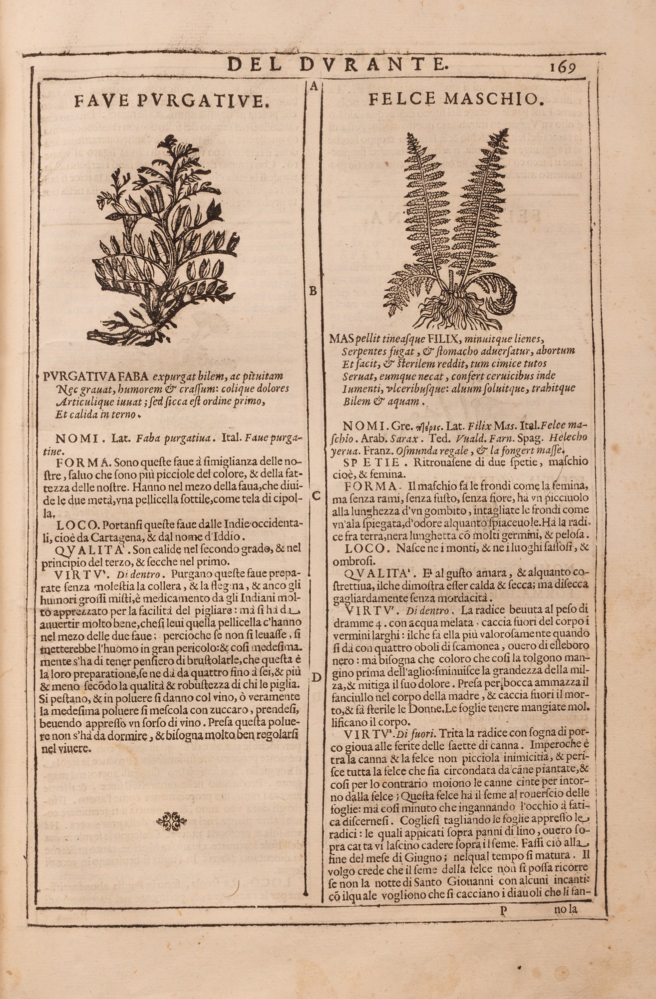 - TITOLO: Herbario nouo di Castore Durante medico, et cittadino romano. Con figure, che rappresentano le viue piante, che nascono in tutta Europa & nell'Indie orientali, & occidentali. Con versi latini, che comprendono le facoltà de i semplici medicamenti. Con discorsi, che dimostrano i nomi, le spetie, la forma, il loco, il tempo, le qualità, & le virtù mirabili dell'herbe, ... Con due tauole copiosissime, l'vna delle herbe, & l'altra delle infirmità, ... Con aggionta in quest'vltima impressione de i discorsi a quelle figure, che erano nell'Appendice, fatti da Gio. Maria Ferro spetiale della Sanità. ...