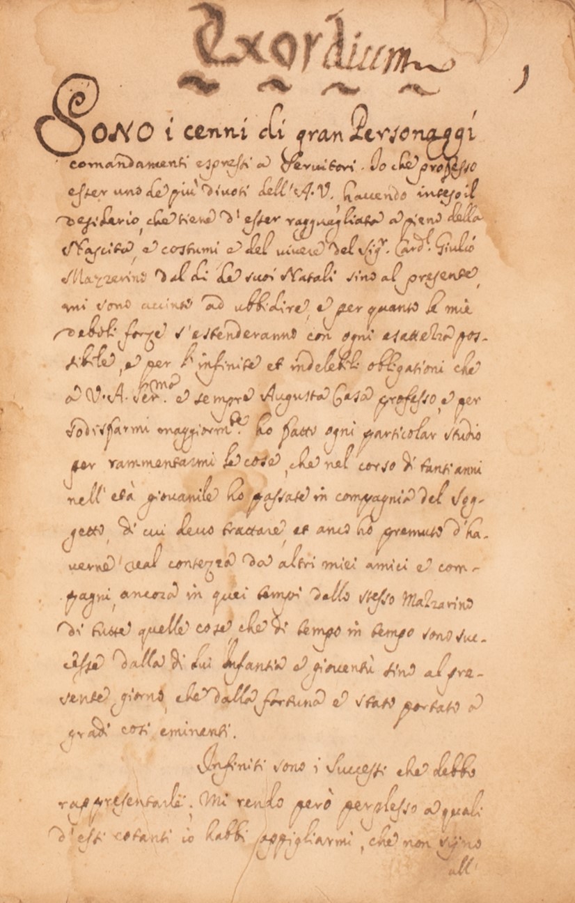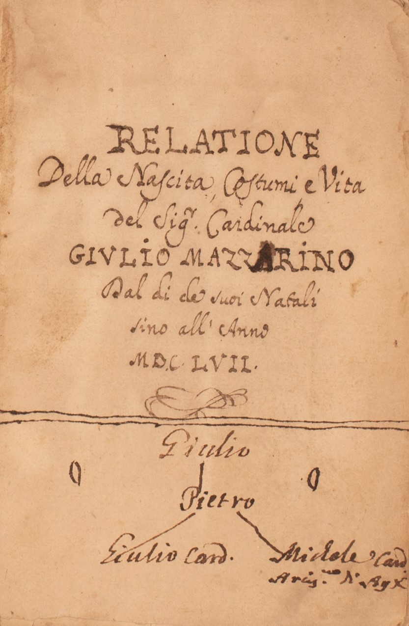 Manoscritto "relazione della Notizia, Costumi e Vita del Sig. Cardinale Giulio Mazzarino Dal dì de' suoi Natali sino all'anno 1657"