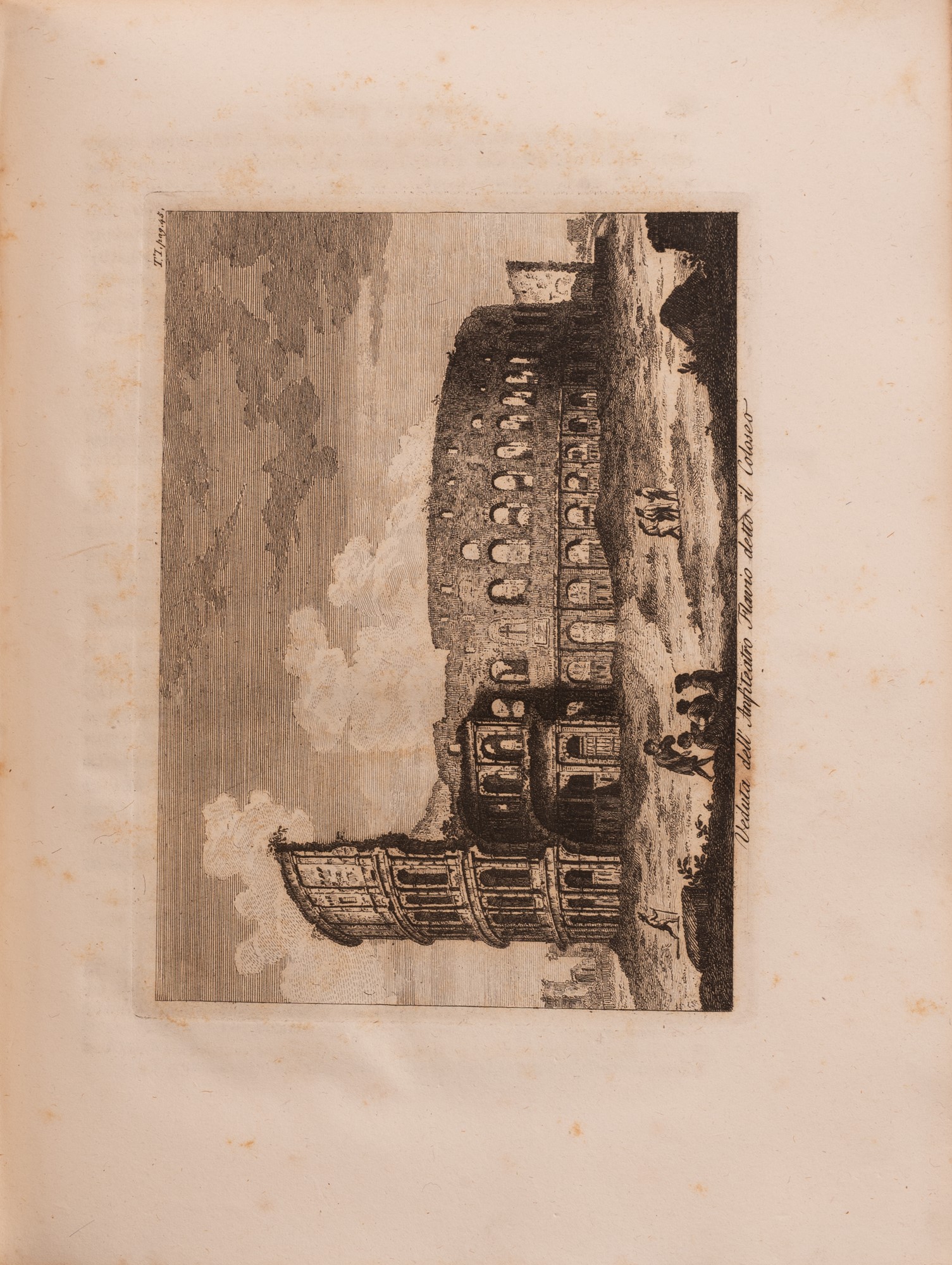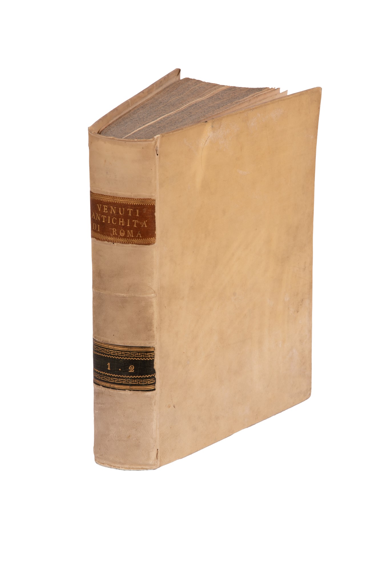 DESCRIZIONE: 4° (cm 21,2 x 28) – 2 volumi insieme – pagine (4) – XVI – XXXII – 256; VI – 238 – (2) con due frontespizi incisi – 1 ritratto e complessive 69 tavole incise fuori testo (una ripiegata) – alcune incise dal Piranesi. Solida ed elegante legatura coeva in piena pergamena rigida – titolo oro su duplice tassello al dorso – tagli spruzzati. Piccoli restauri in 3 diversi punti del frontespizio (parte bianca) – fioriture sparse ma bell’esemplare ottimamente legato.