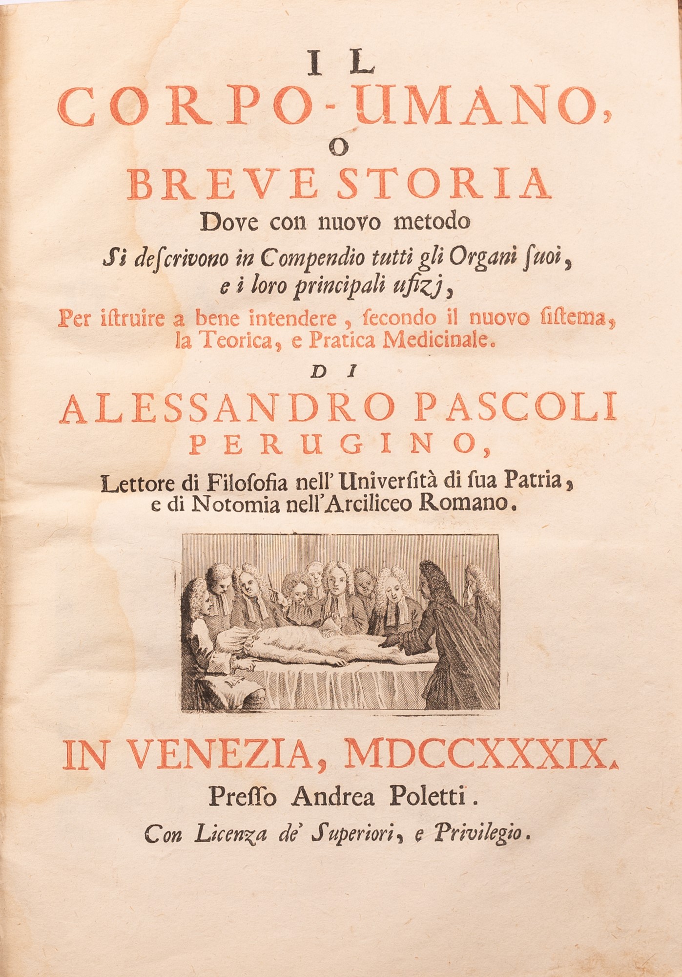 - TITOLO: Il corpo-umano, o Breve storia dove con nuovo metodo si descrivono in compendio tutti gli organi suoi, e i loro principali ufizj, per istruire a bene intendere, secondo il nuovo sistema, la teorica, e pratica medicinale. Di Alessandro Pascoli perugino