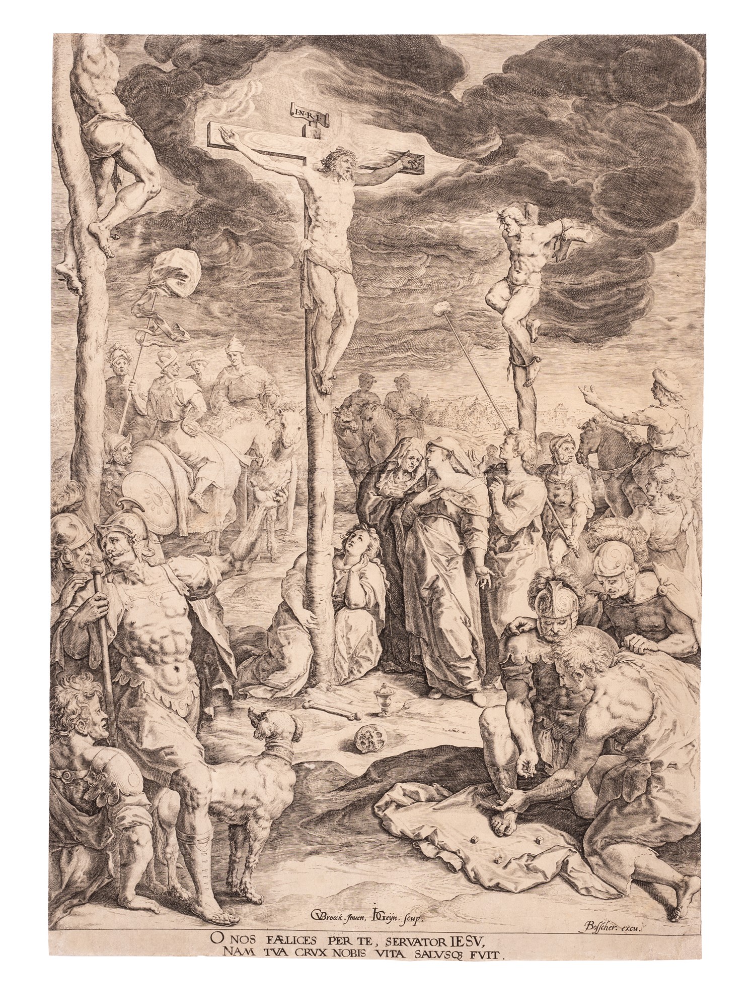 (Anversa, 1565 - L'Aia, 1629) - Scena di Cristo in croce tra i due ladroni. Intorno allacroce Maria, Giovanni Evangelista, Maria Maddalena, il portatore di spugne,soldati romani (alcuni giocavano a dadi per le vesti di Cristo), cavalieri e uncane. Pubblicato da Bosscher, ca. 1600.
