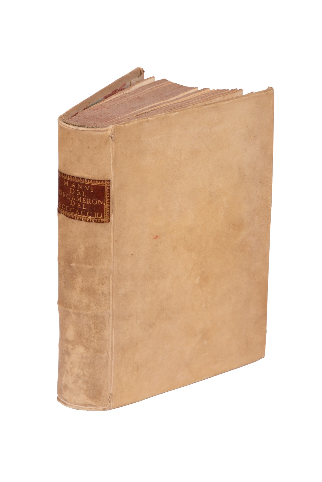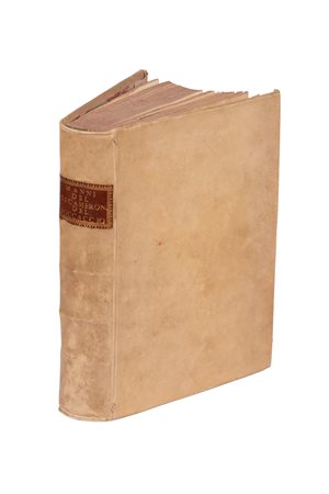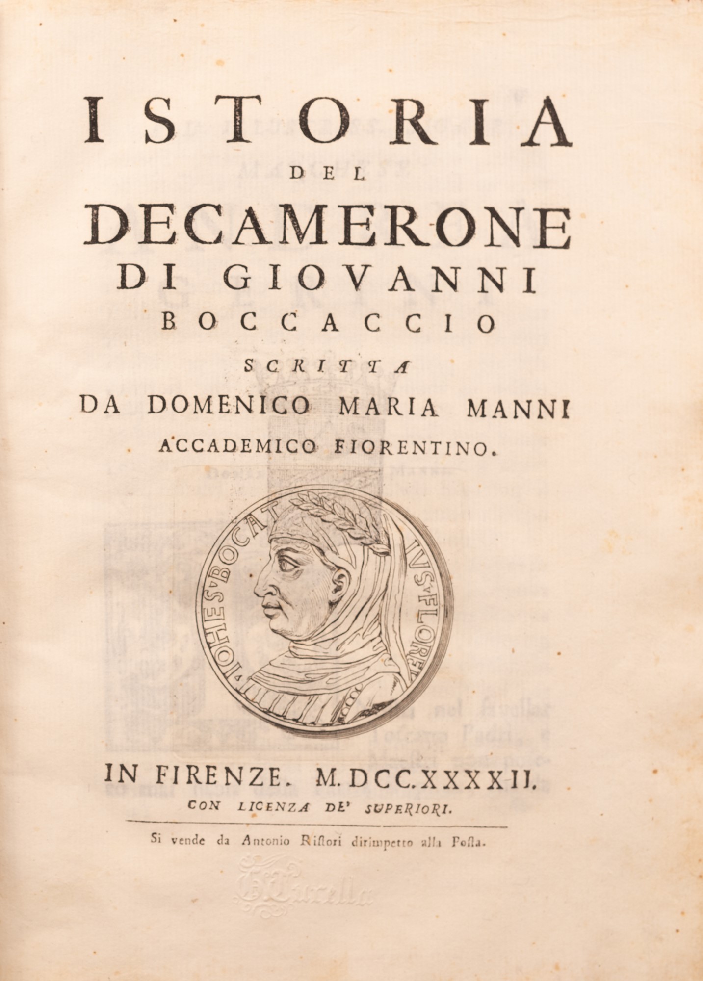 DESCRIZIONE: XXX, 672 [i.e. 678], [2] p., [2] carte di tav. di cui 1 ripiegata : ill. ; 4º, legatura in piena pergamena coeva con titoli in oro al dorso, volume completo e ben conservato tranne una macchia di umido che interessa le ultime 60 pagine e le prime tre e che ha intaccato la legatura posteriormente, piccoli restauri alle prime pagine ed al frontespizio. Ritratto del Boccaccio su medaglione al front., 2 tavv. f.t. di cui la prima in legno e la seconda ripieg. in rame (queste ultime ritraggono rispettivamente la casa del Boccaccio e lo splendido epitaffio del poeta, che tradizione vuole essere stato pronunciato dal poeta stesso sul letto di morte). Alcune xilogr. raffiguranti sigilli n.t. Ricercata biografia del Boccaccio, la più bella e documentata mai andata alle stampe, che ampliò e corresse i lavori analoghi compilati in precedenza da Girolamo Squarcifico, Giannozzo Manetti e Filippo Villani. I primi XXXV capi di questa meritoria fatica del Manni ci danno informazioni distinte toccanti nascita, patria, studi, viaggi, impieghi e morte del poeta. Rilevante a questo riguardo anche le informazioni intorno ai legati e alle esecuzioni testamentarie, dalle quali apprendiamo aver il Boccaccio lasciato tutti i suoi libri al padre Martino da Signa, maestro di teologia nel Convento di Santo Spirito in Firenze. La seconda parte dell'opera è dedicata a spiegare separatamente ciascuna delle cento novelle che compongono il Decamerone, la terza e ultima parte è impiegata a illustrare e raffrontare le diverse redazioni manoscritte dell'opera.