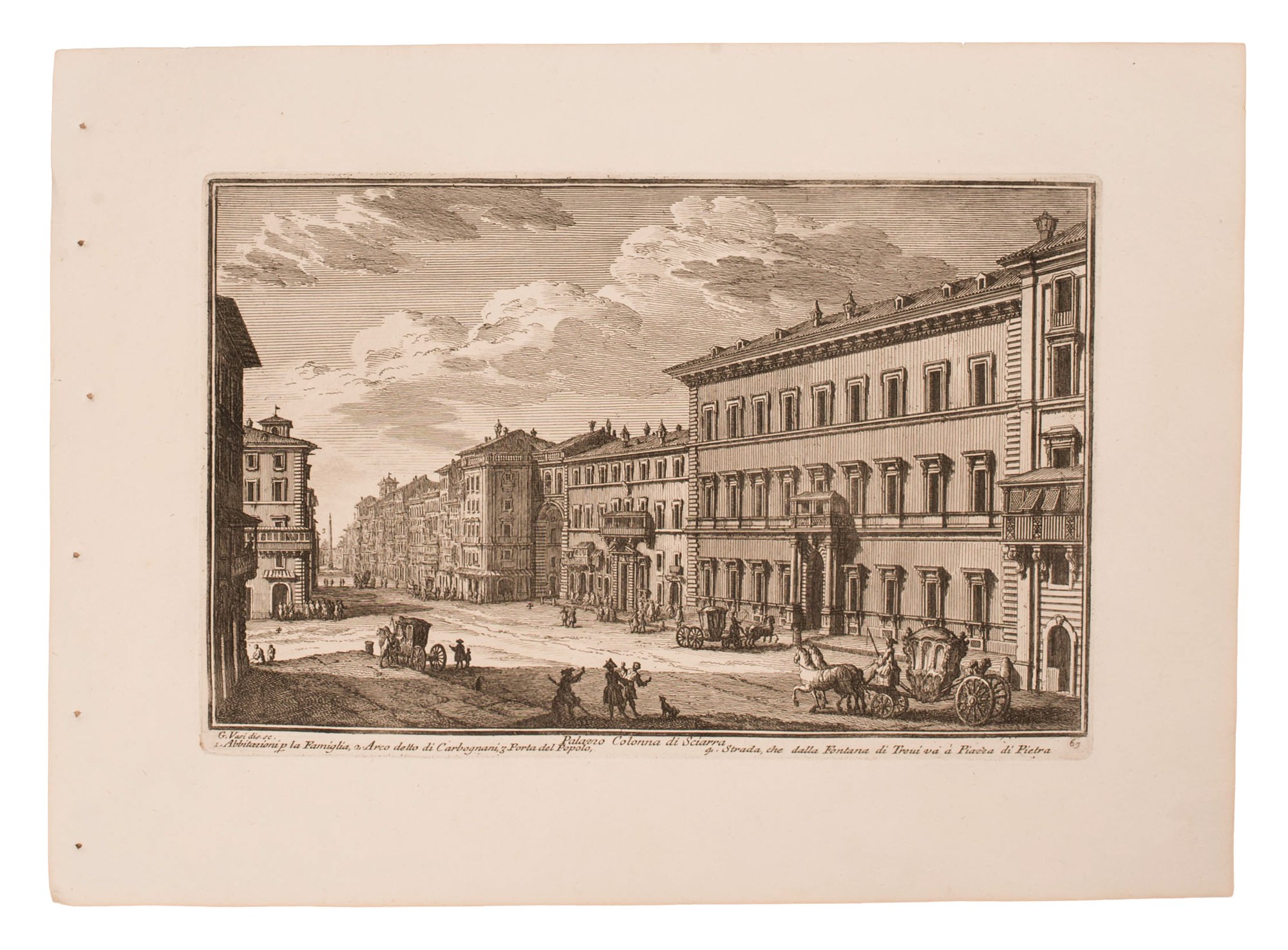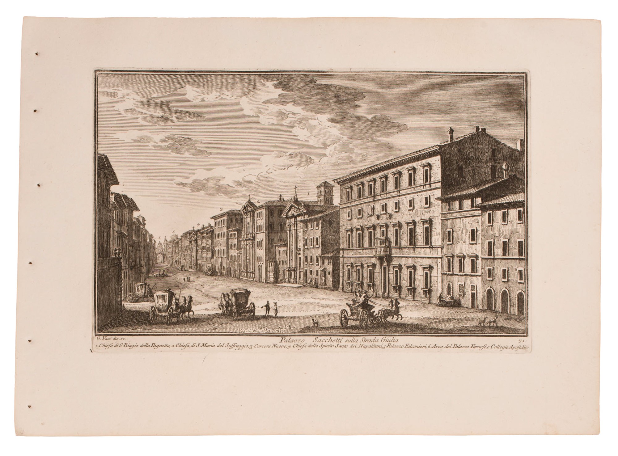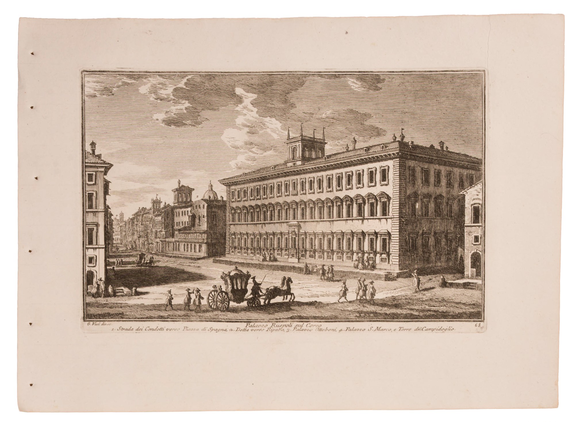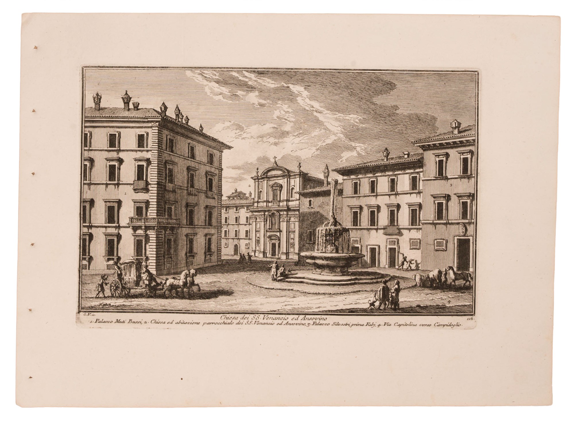 - Incisione all'acquaforte del 1745-1765. Misura alla battuta del rame cm 21 x 32.5. In discrete condizioni, ha due piccoli restauri visibili sulla sinistra, su carta vergata priva di filigrana. Incisa da Vasi Giuseppe. Pittore, disegnatore, architetto,archeologo, incisore all’acquaforte ed al bulino. Nato a Corleone (PA) il 28 Agosto 1710, morto a Roma il 16 Aprile 1782. Dopo aver praticato la pittura nel suo paese, venne a Roma e fu allievo di Sebastiano Conca, P. L. Ghezzi e dello Juvara. Acquistò fama di abile incisore e lavorò per illustri protettori quali Ferdinando e Carlo III di Napoli, Benedetto XIV. Fu incisore della corte di Napoli e fatto cavaliere. Le sue opere incise sono immortali. Eseguì delle pitture visibili a Palazzo Farnese ed al Palazzo di Caprarola. Piranesi fu suo allievo.