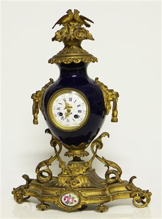 Orologio da tavolo. Bronzo e porcellana. Cm 35,00 x 54,00 x 15,00. Porcellana di colore blu con decorazioni in bronzo dorato.