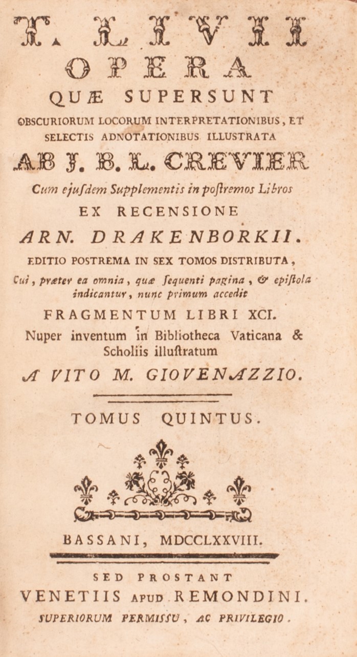 Opera que supersunt obscuriorum locorum interpretationibus et selectis adnotationibus illustrata ab j.b.l. crevier. recensione arn. drakenborkii (Tomus Quintus) Bassani, 1778 Venetiis, apud Remondini