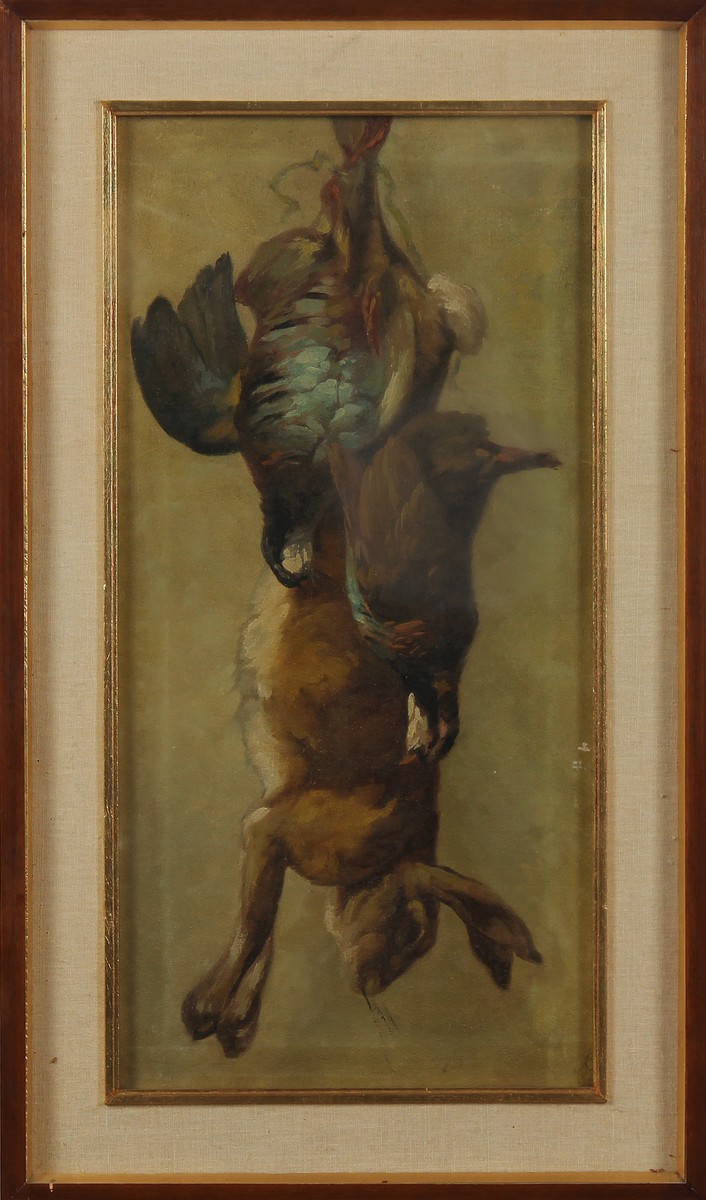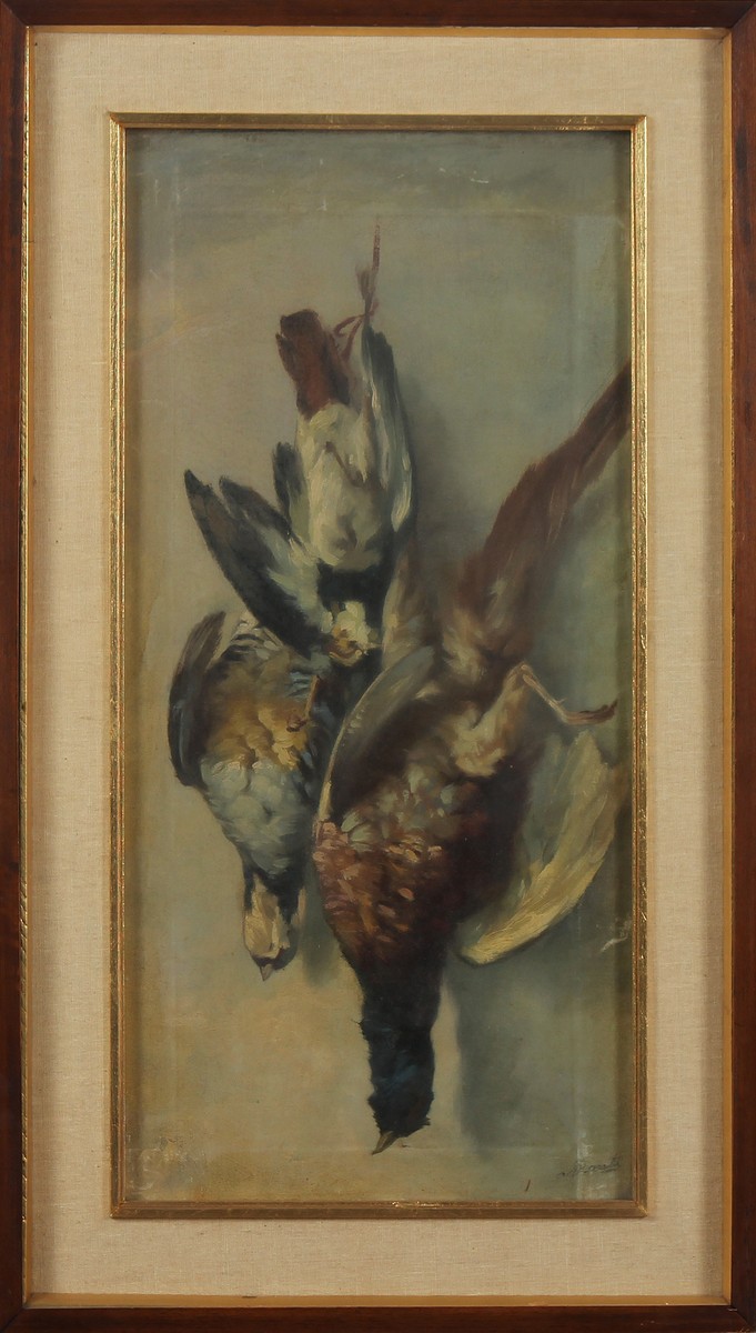 SCROSATI LUIGI (1814 - 1869) Lotto composto da n. 2 opere raffiguranti nature morte di cacciagione. Olio su tela . Cm 31,00 x 61,00. . Cornice presente
