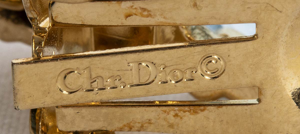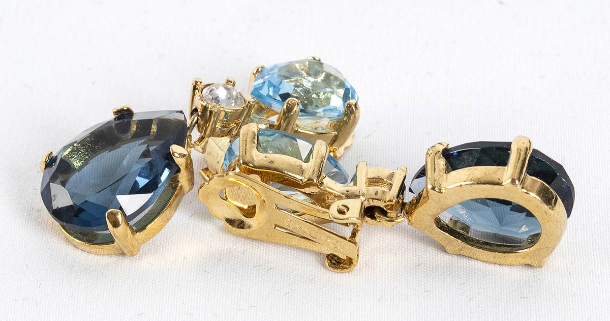 Orecchini a clip pendenti Christian Dior anni 80 in metallo dorato, cristalli colorati e strass, grado di condizione generale B