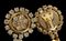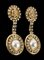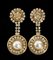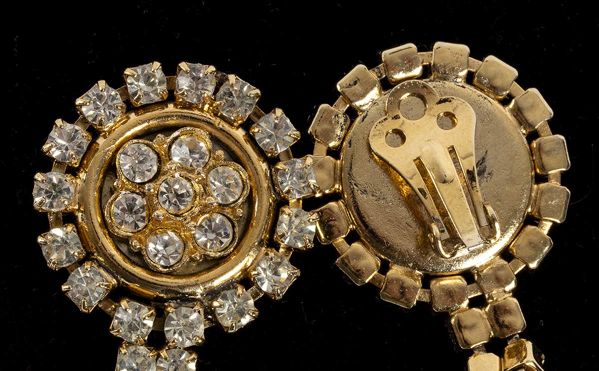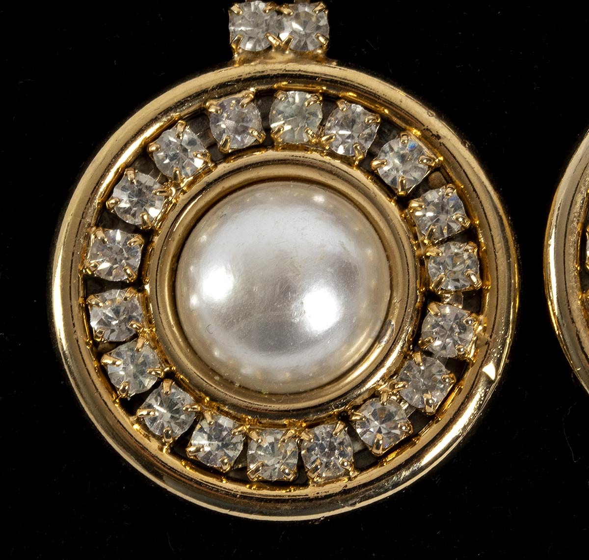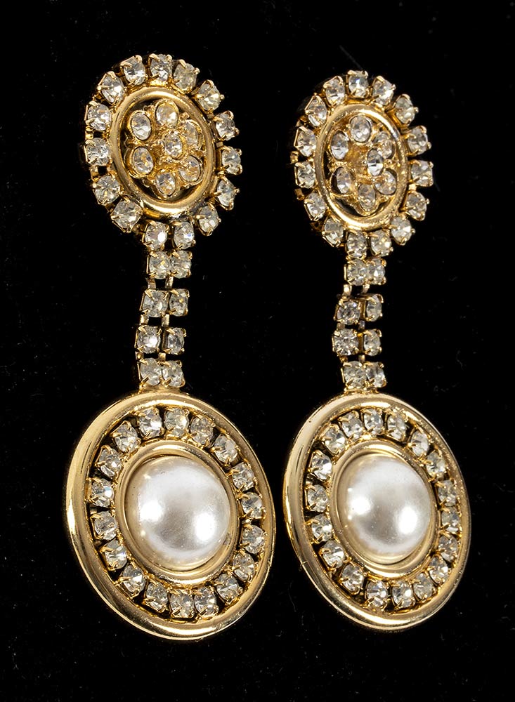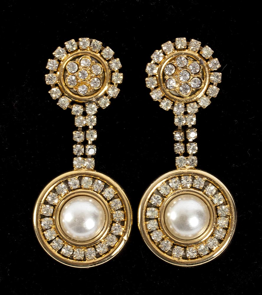 Orecchini pendenti Lancetti anni 90 in metallo dorato, perle finte e strass, grado di condizione generale B
