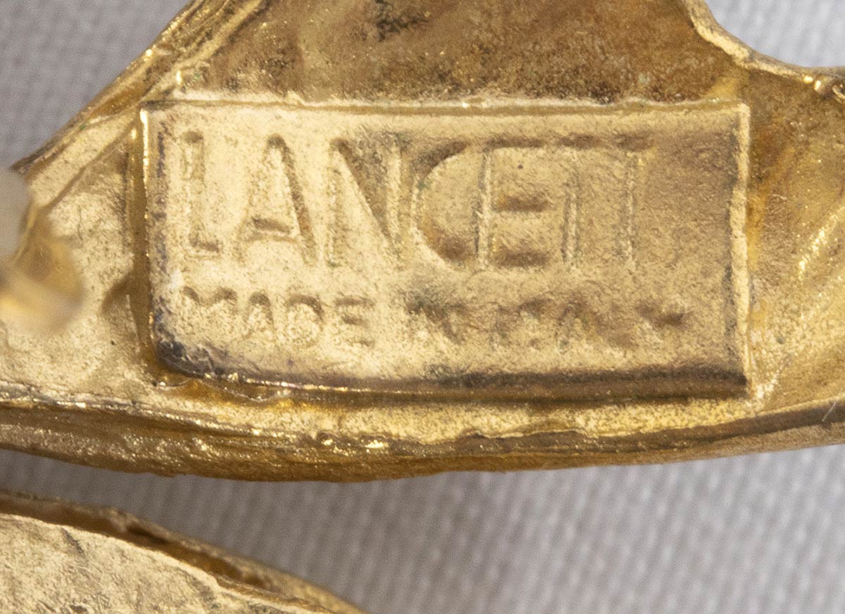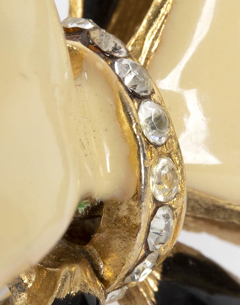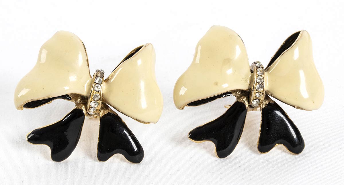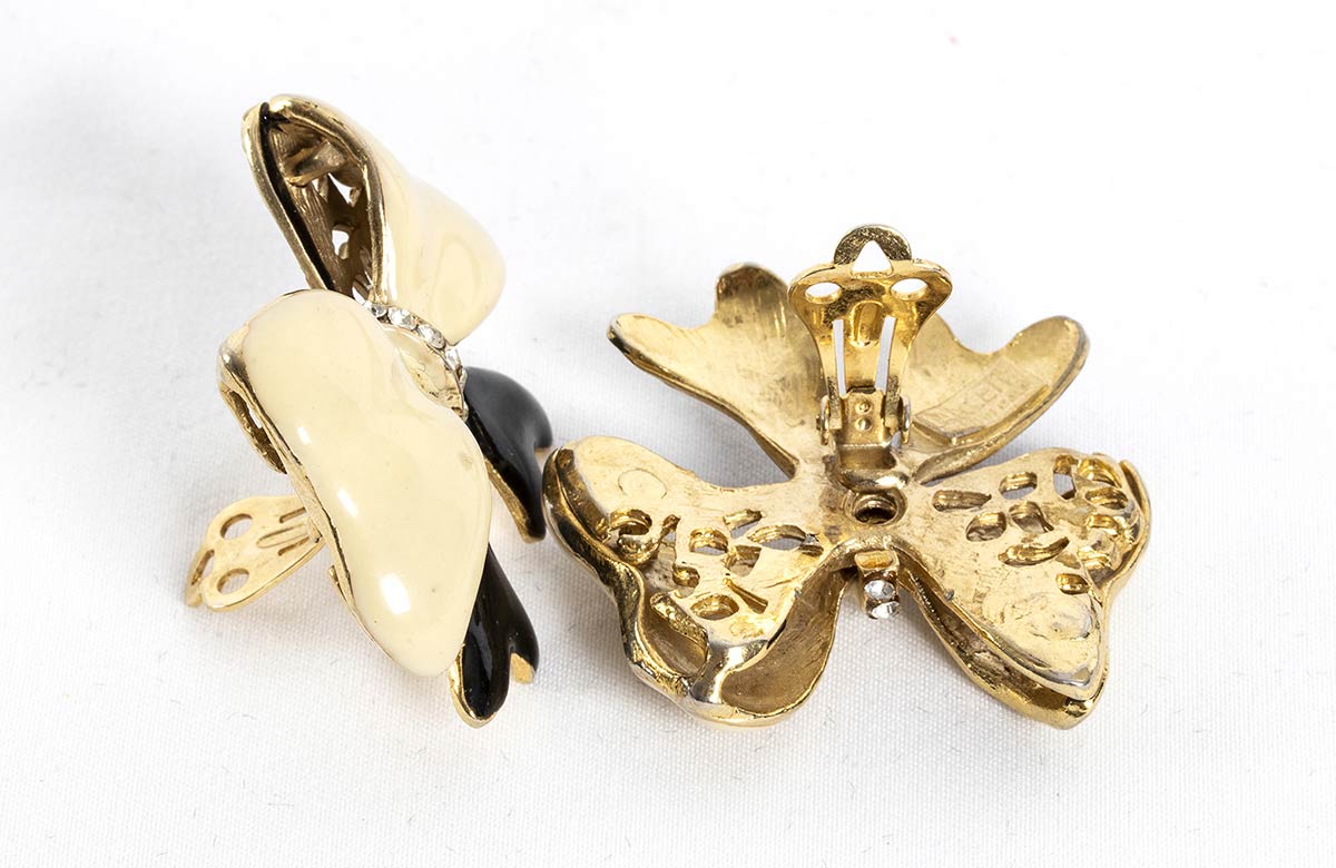 Orecchini a clip Lancetti anni 80, metallo dorato, strass, smalti nero e rosa chiaro, grado di condizione generale B/C (segni di utilizzo)