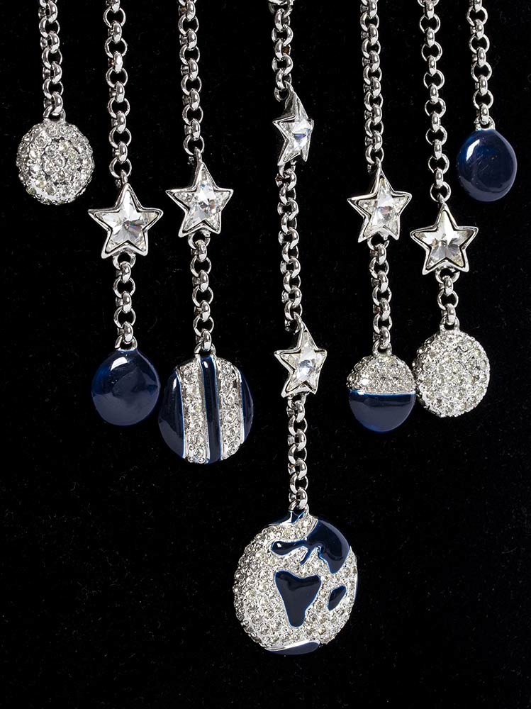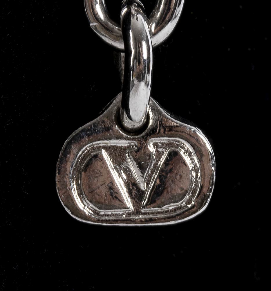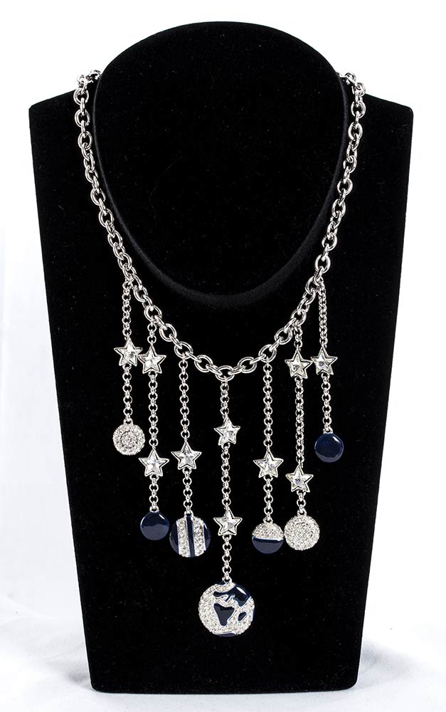 Collana Valentino inizio anni 90 in metallo argentato elementi pendenti in metallo, pasta di vetro blu e/o strass, grado di condizione generale B