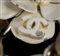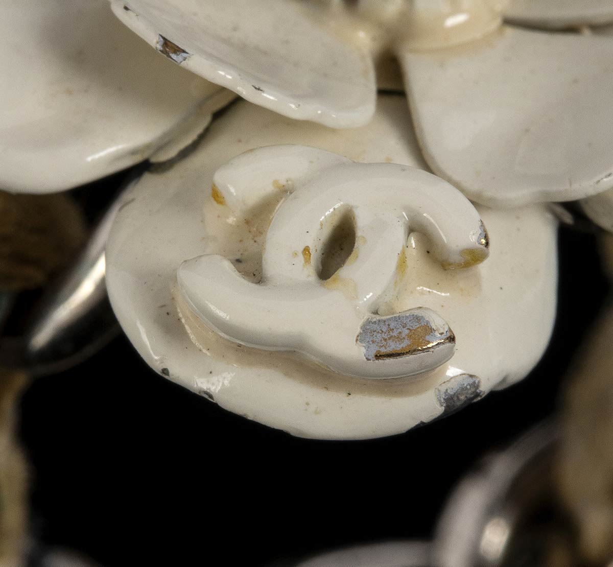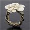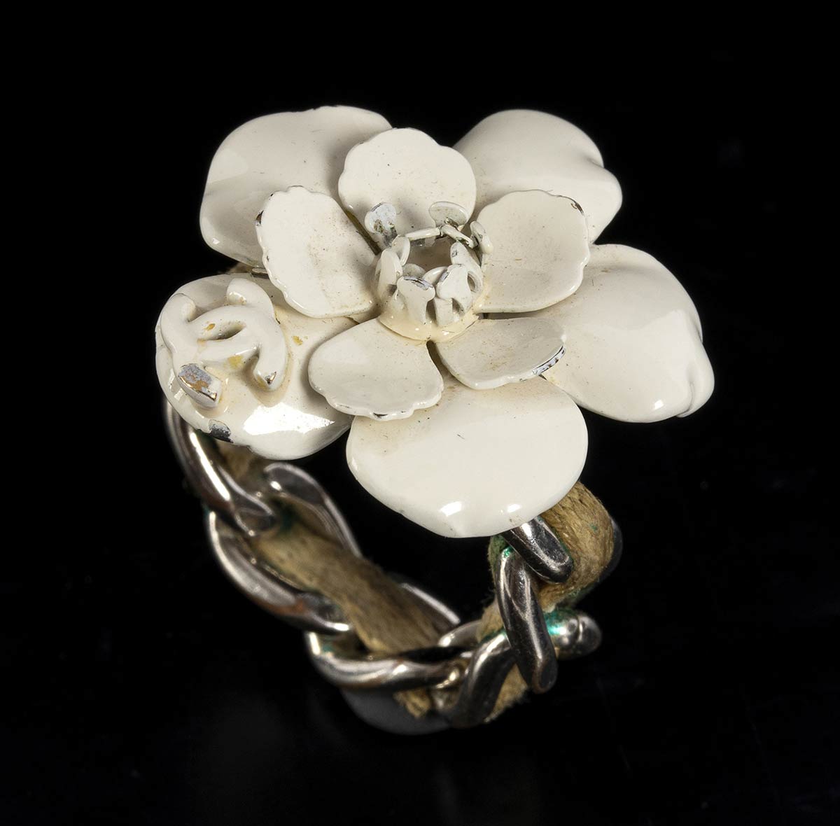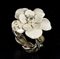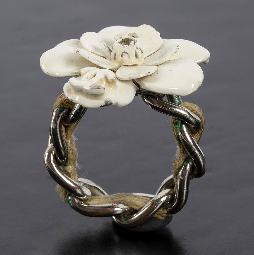 Anello Chanel anni 90 a forma di fiore, smalto avorio metallo argentato, fascia in pelle, grado di condizione generale C/D (segni di utilizzo)