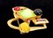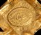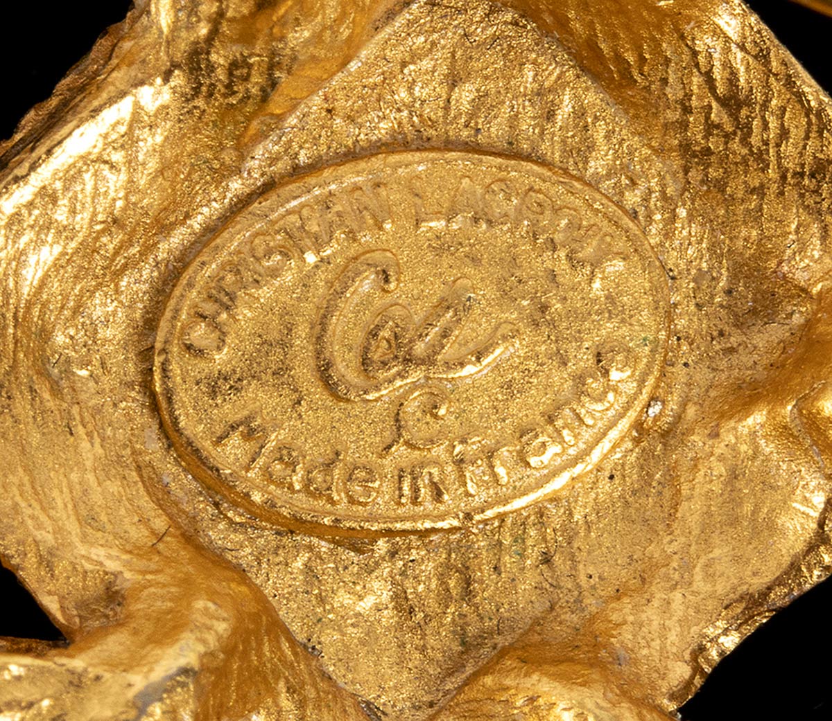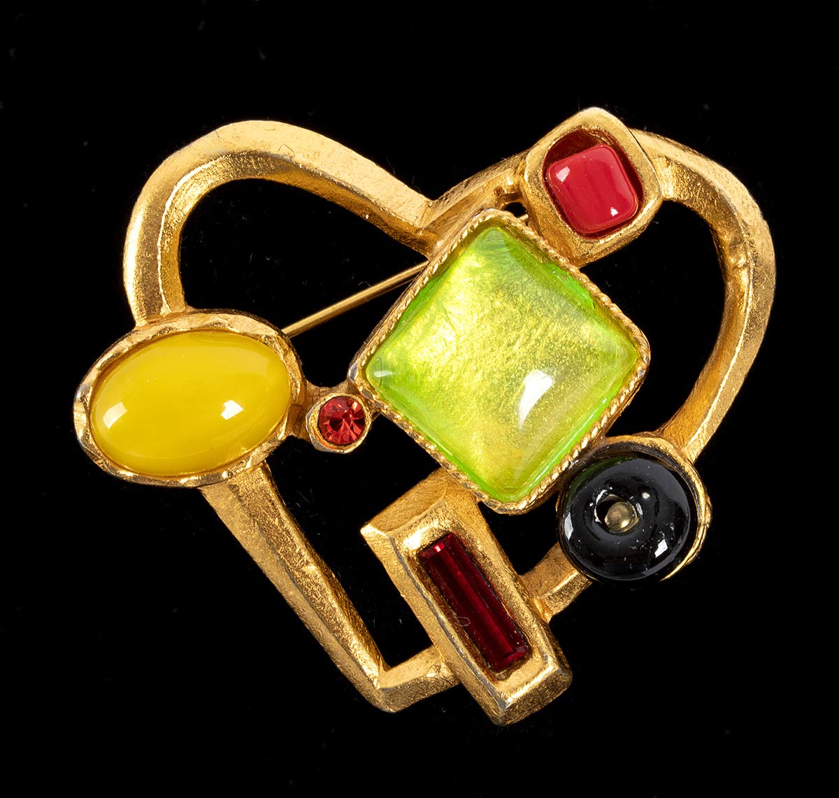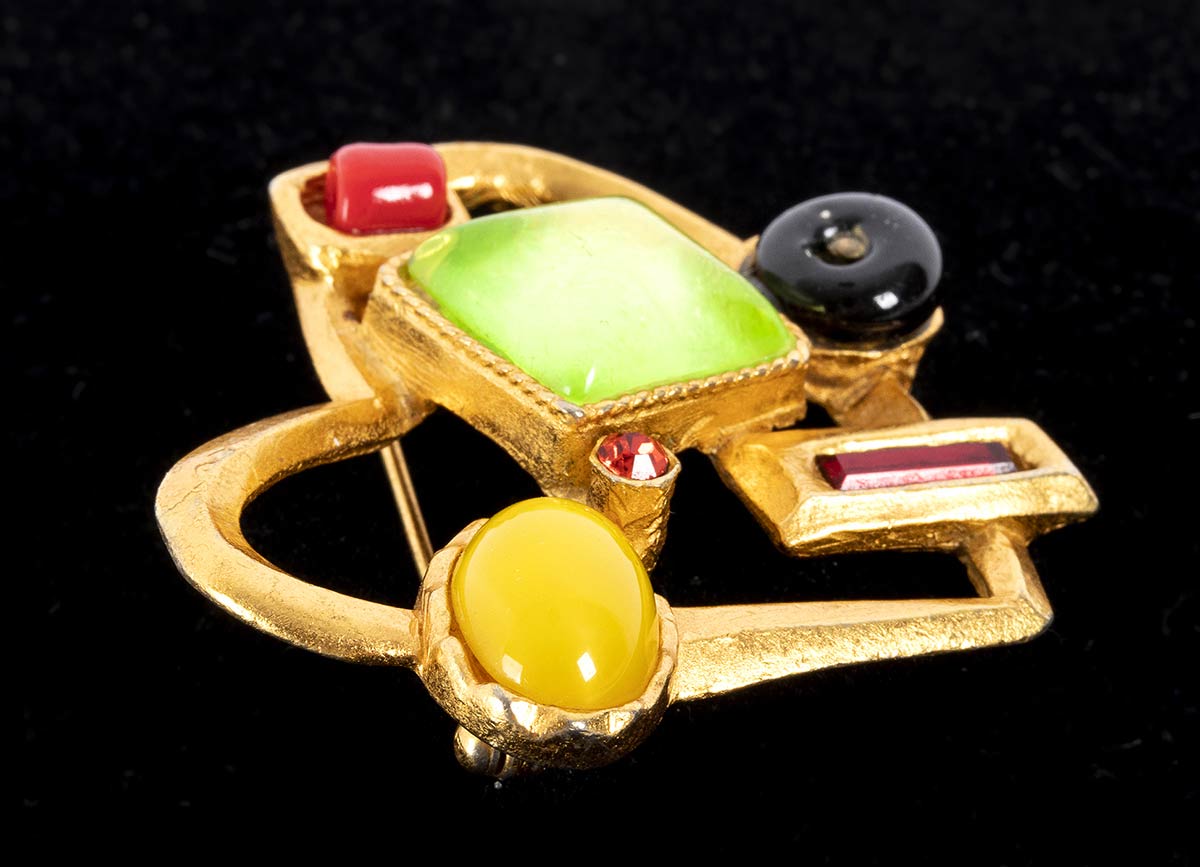 Spilla anni 90 Christian Lacroix in metallo dorato, paste vitree colorate, grado di condizione generale C (pasta vitrea/perlina rossa non originale)