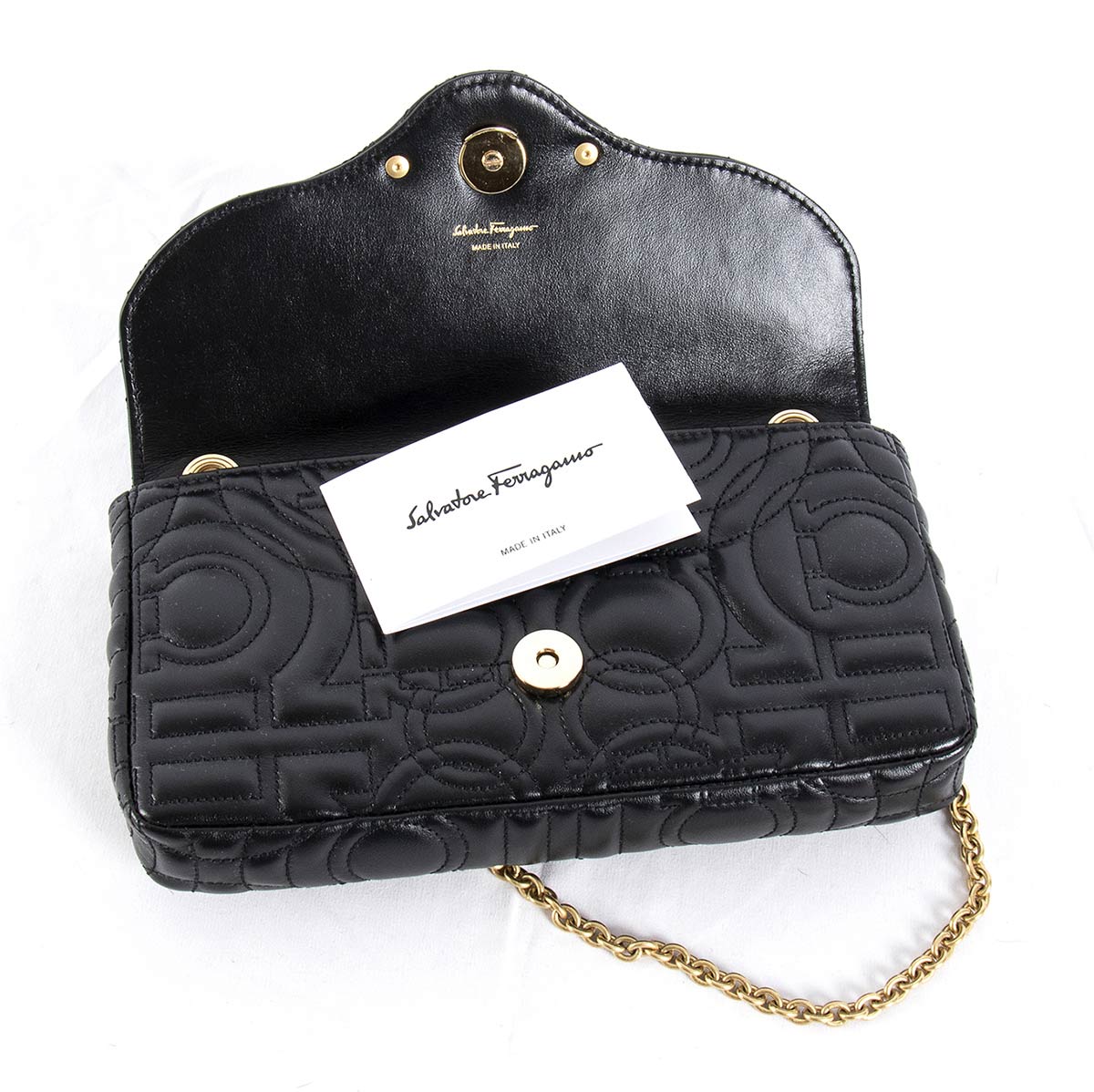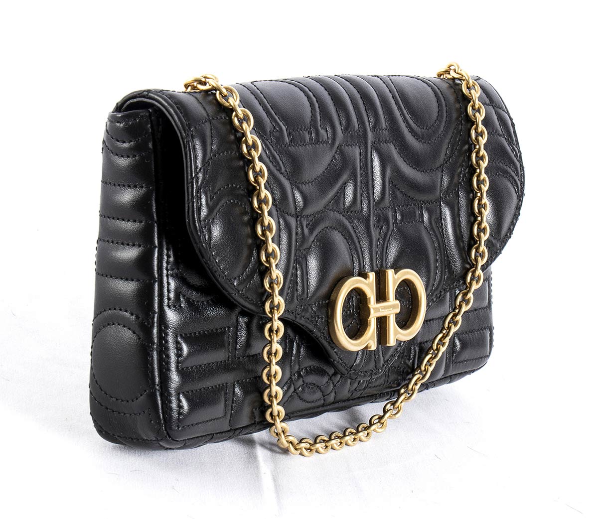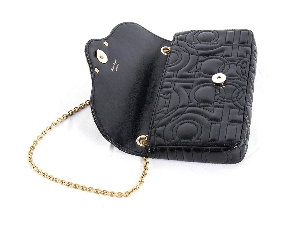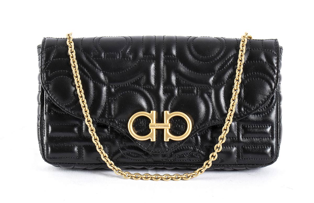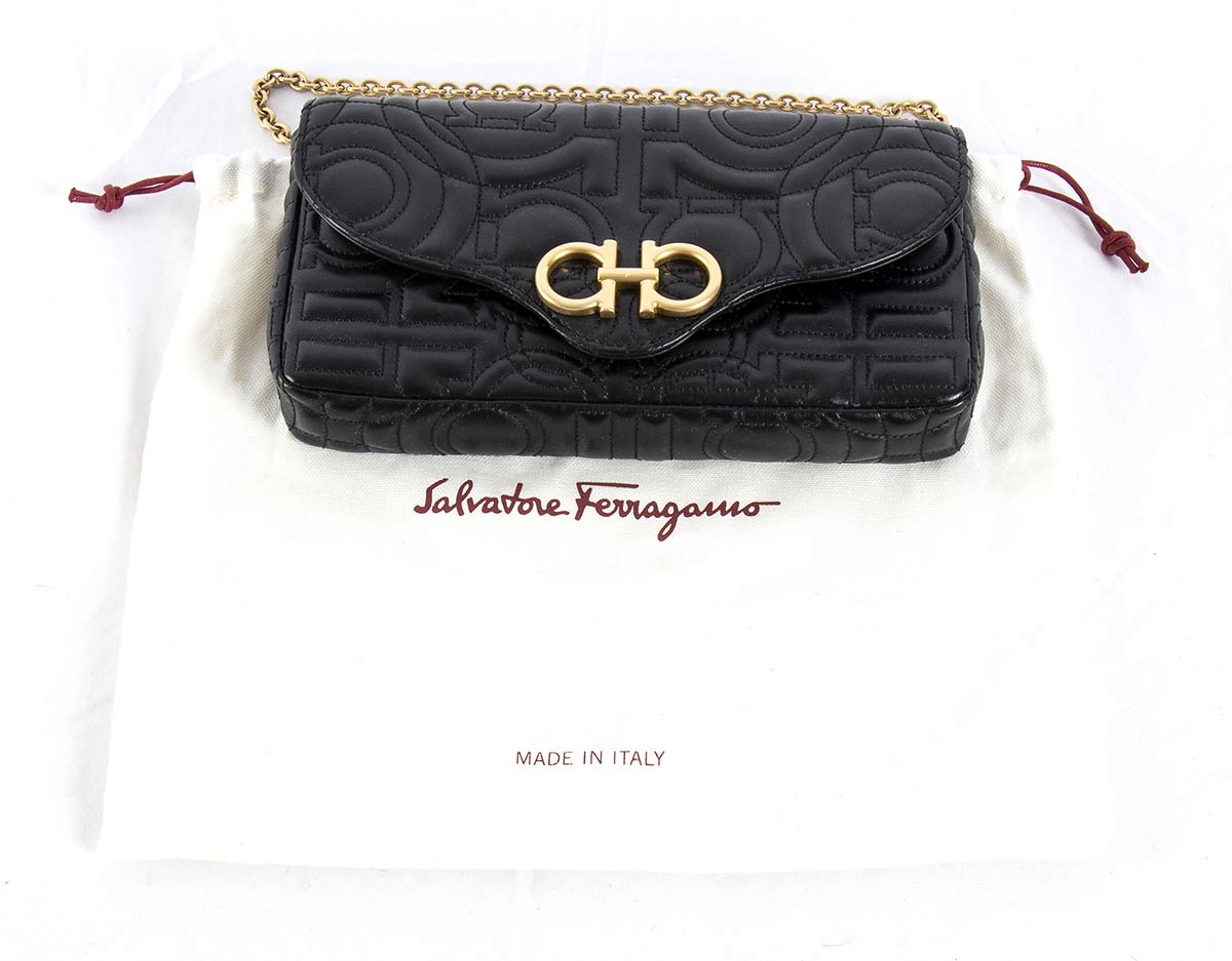 Borsa Ferragamo 2021 modello "Gancini", pelle nera lavorazione matellassé, minuteria e catena in metallo dorato, scatola originale, grado di condizione generale A