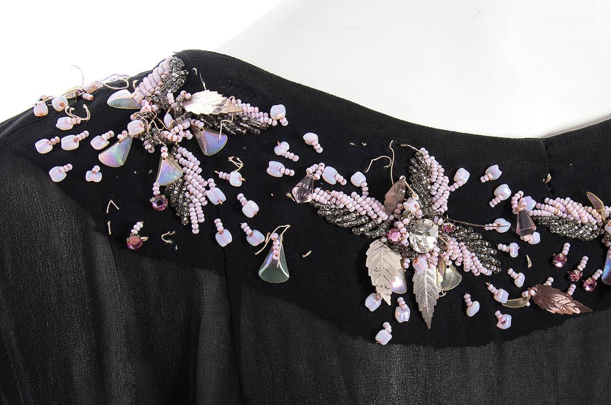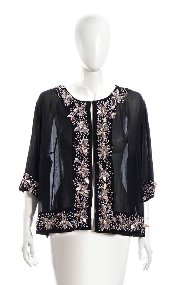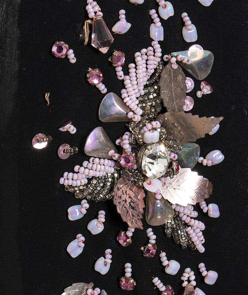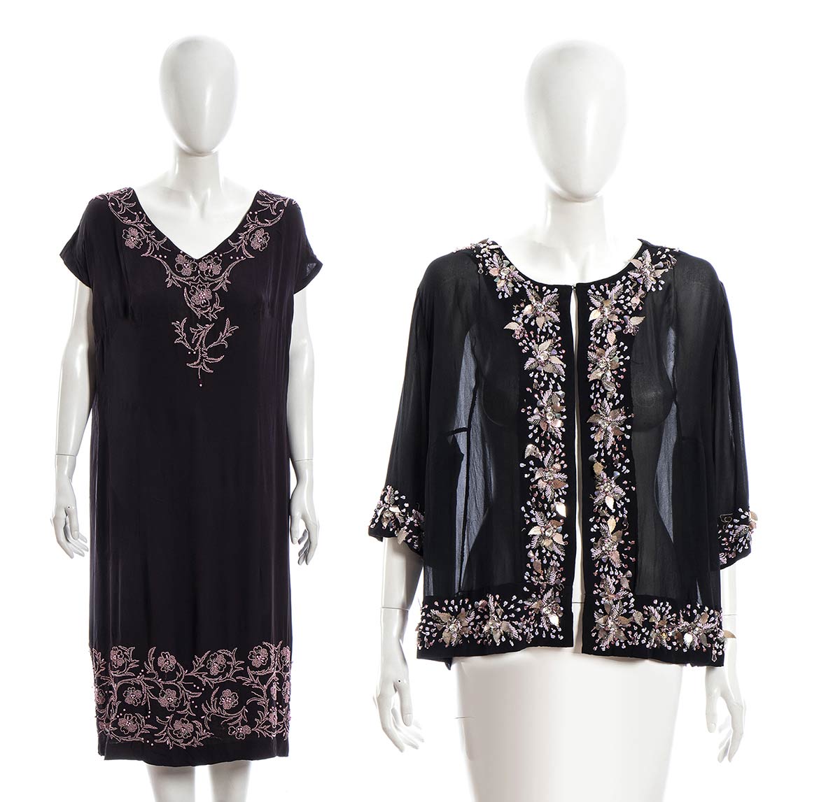 Lotto di 2 articoli ricamati anni 40/50: un abito ed un giacchino da sera in seta, tg 48 ca, grado di condizione generale C (segni di utilizzo, perdita di perline)