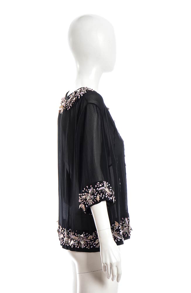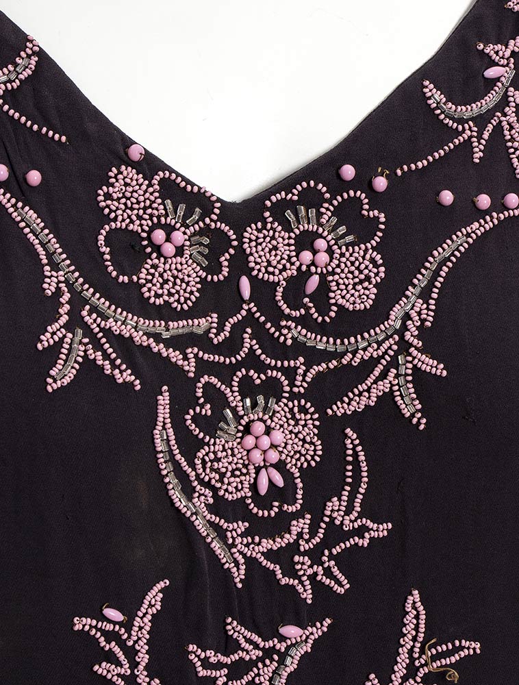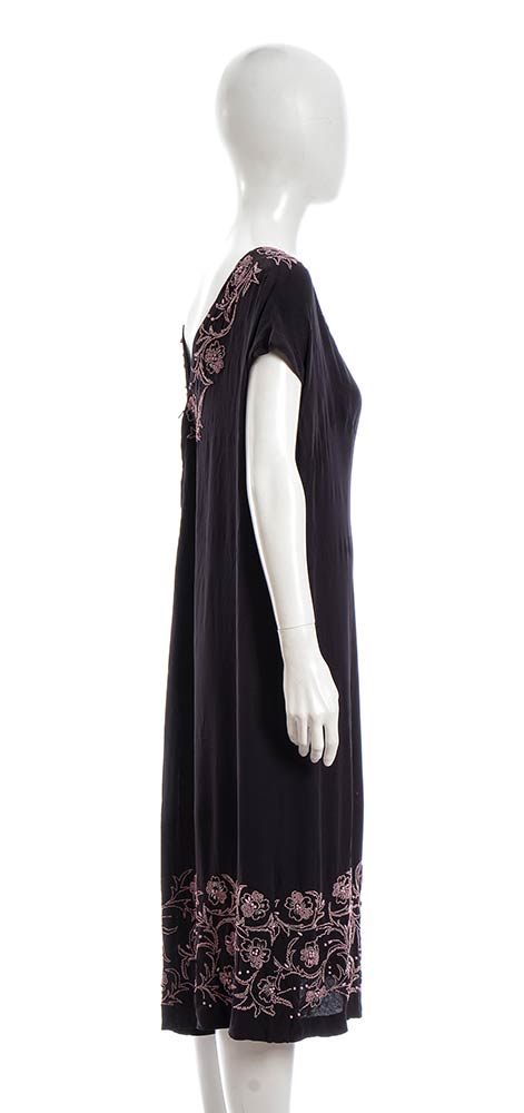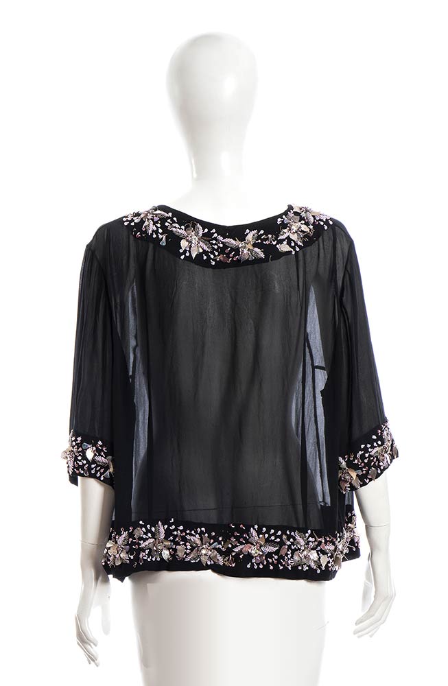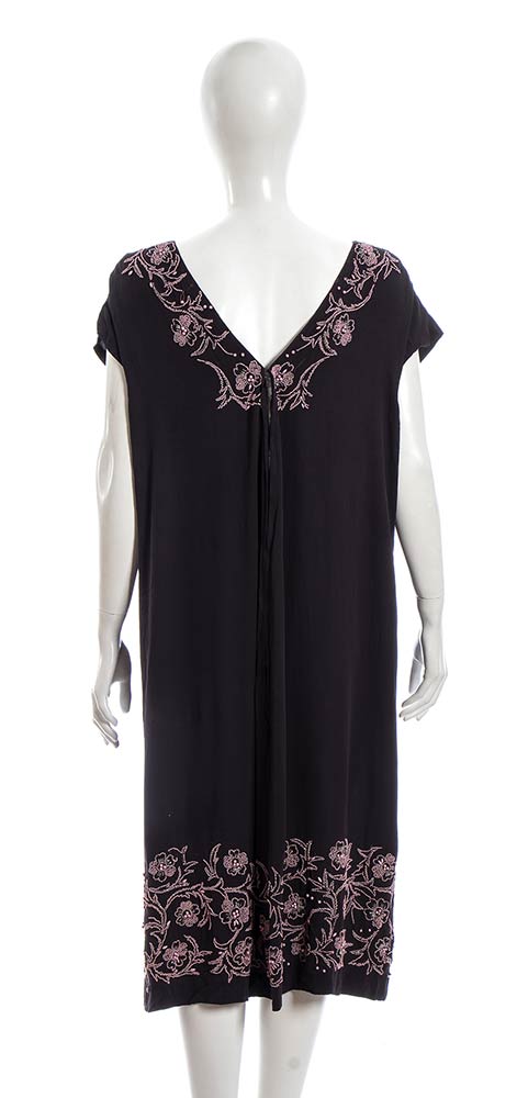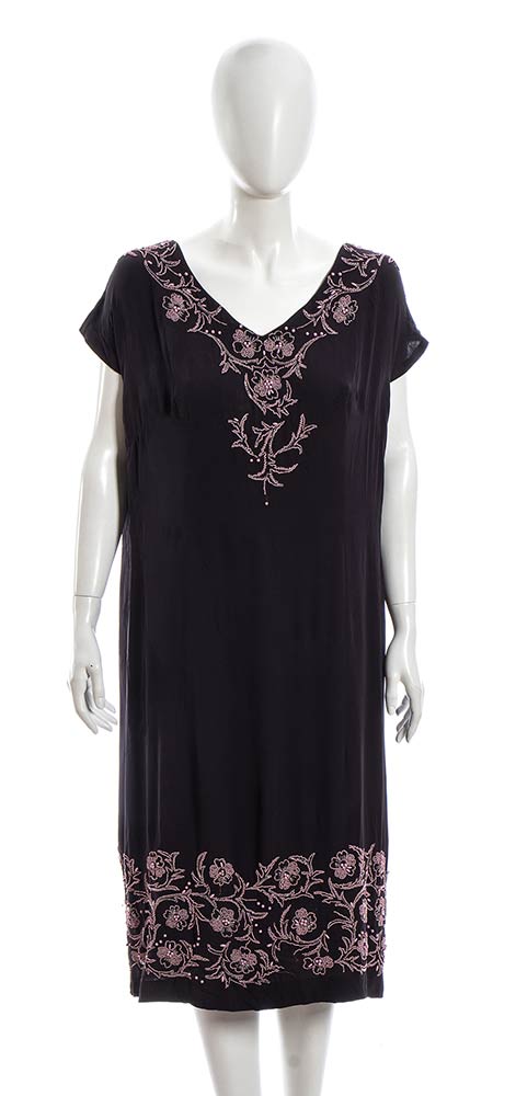 Lotto di 2 articoli ricamati anni 40/50: un abito ed un giacchino da sera in seta, tg 48 ca, grado di condizione generale C (segni di utilizzo, perdita di perline)
