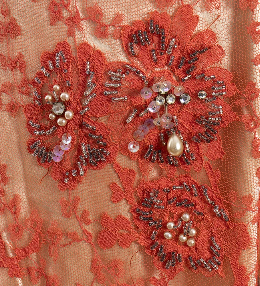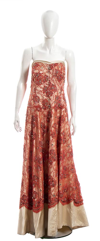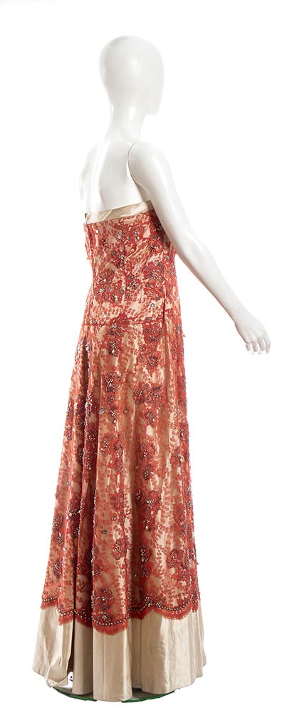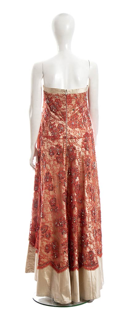 Abito da sera metà anni 50 base in seta avorio, pizzo applicato rosso salmone, ricamo con perline, paillettes, tg 48 ca, grado di condizione generale C ( pizzo in alcuni punti danneggiato, perdita di perline, segni di utilizzo)