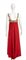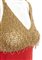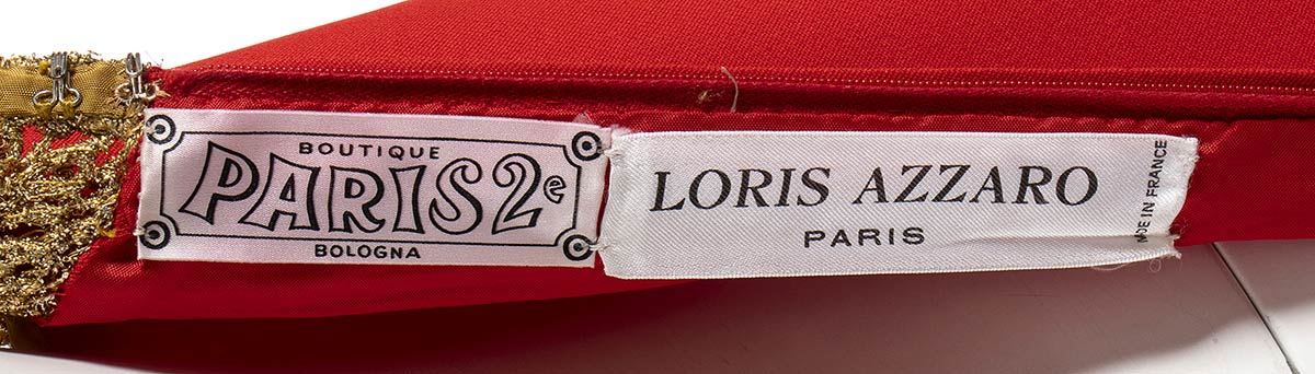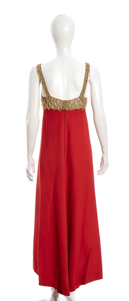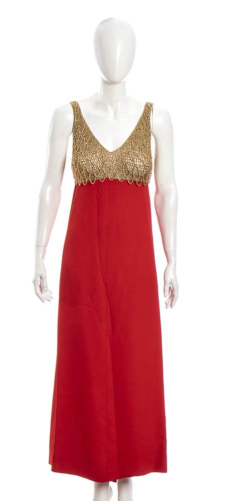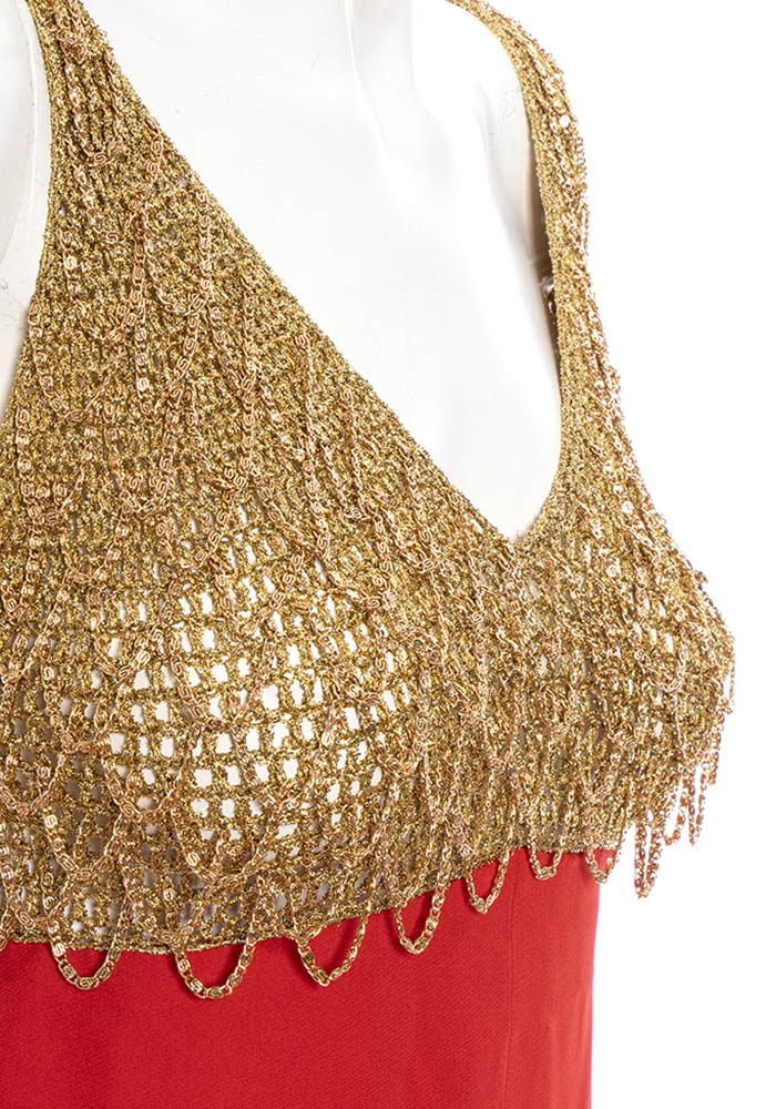 Abito da sera Loris Azzaro fine anni 60 inizio anni 70 in tessuto misto rosso, corpino in maglia dorata con applicazioni di catene in metallo dorato, grado di condizione generale B
