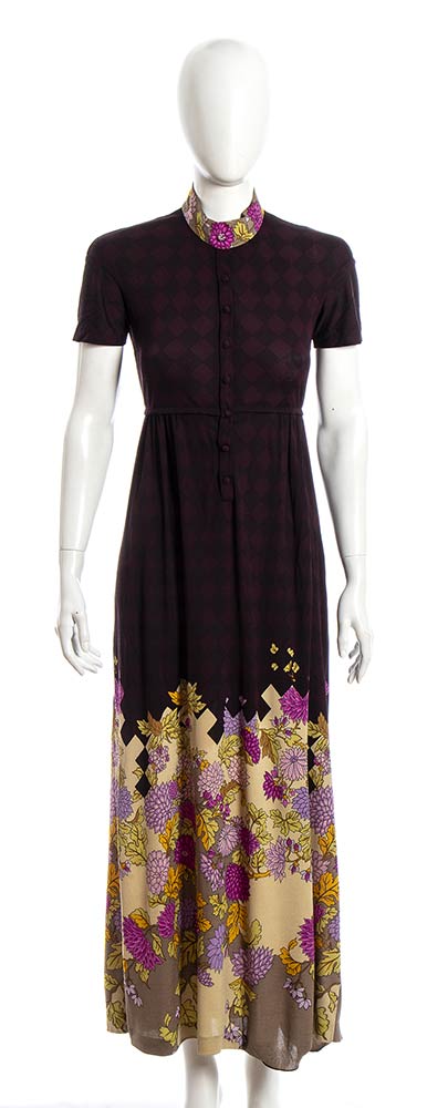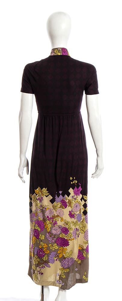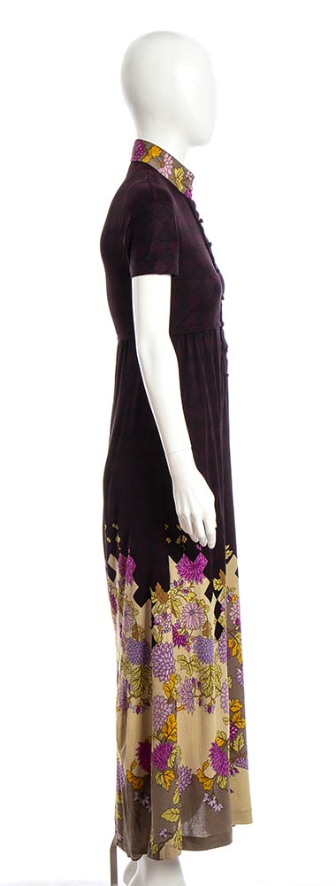 Maxi abito anni 70 De Parisini in seta, fondo viola scuro pattern floreale, grado di condizione generale B