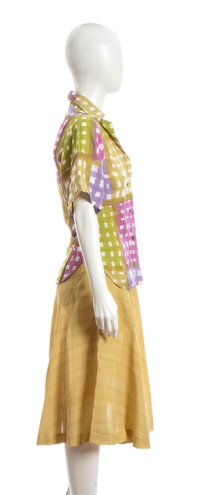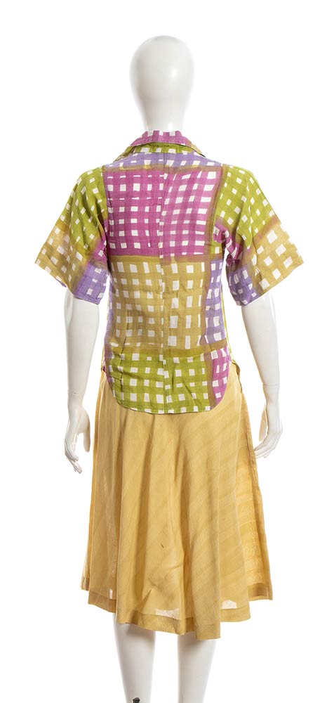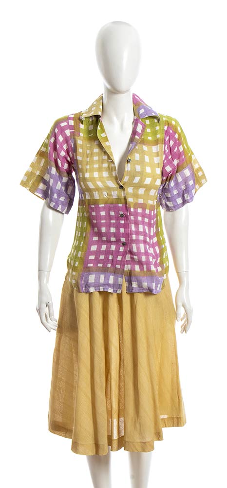Completo (gonna e maglietta) fine anni 70 Livio De Simone in cotone: gonna beige, t-shirt a quadri pattern multicolore, grado di condizione generake A/B