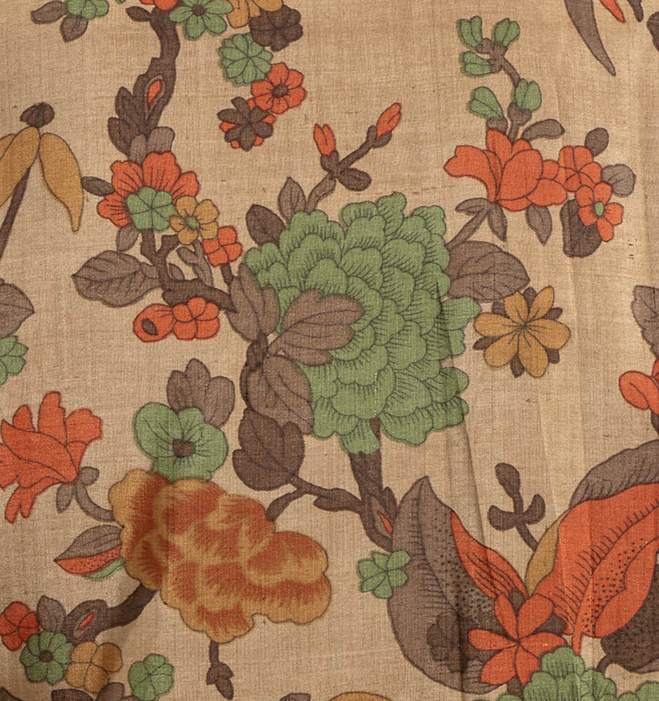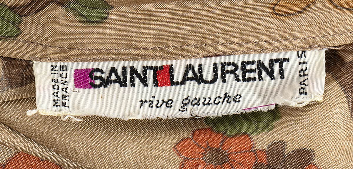 Completo (caftano e pantalone) Saint Laurent Rive Gauche autunno inverno 1979/1980 in seta marrone chiaro con pattern floreale, grado di condizione generale B