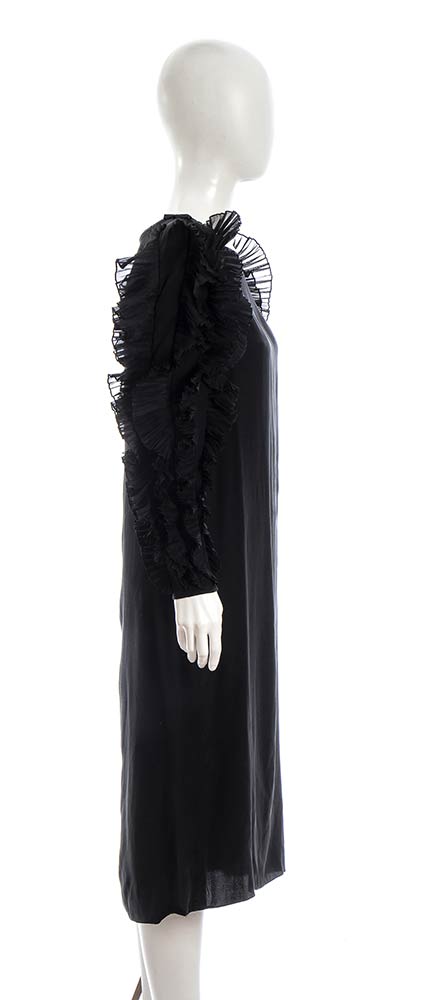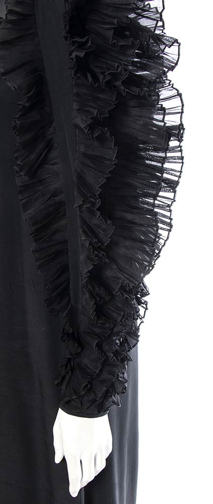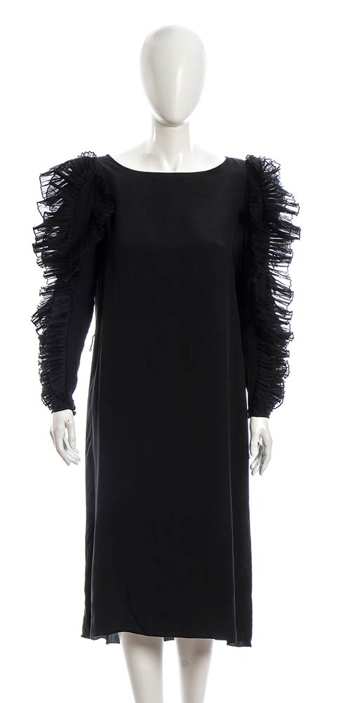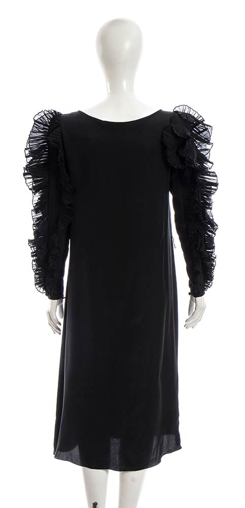 Abito anni 80 Mary Mc Fadden for Jack Mulqueen in seta nera, maniche con profili plissettati, grado di condizione generale B