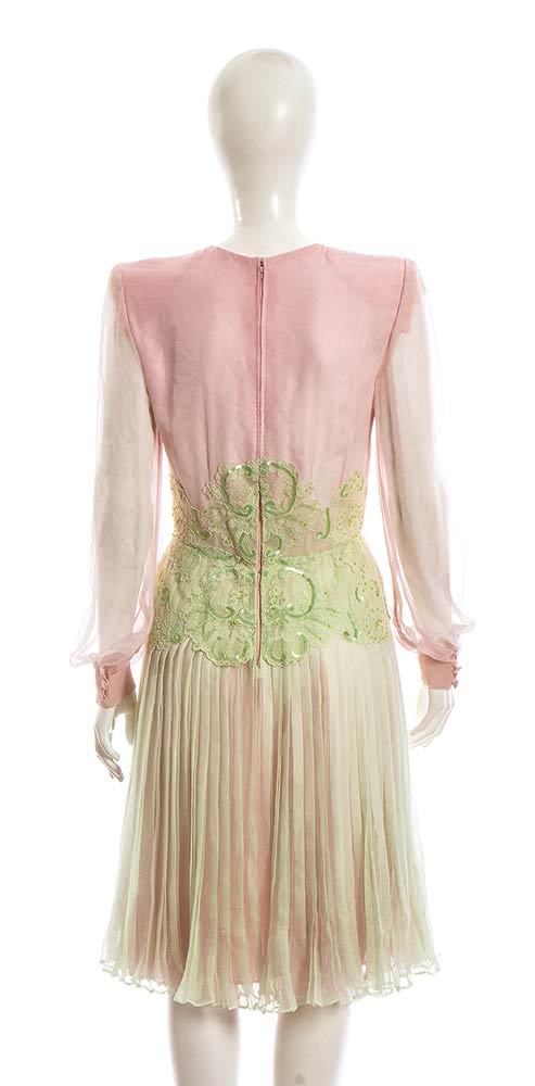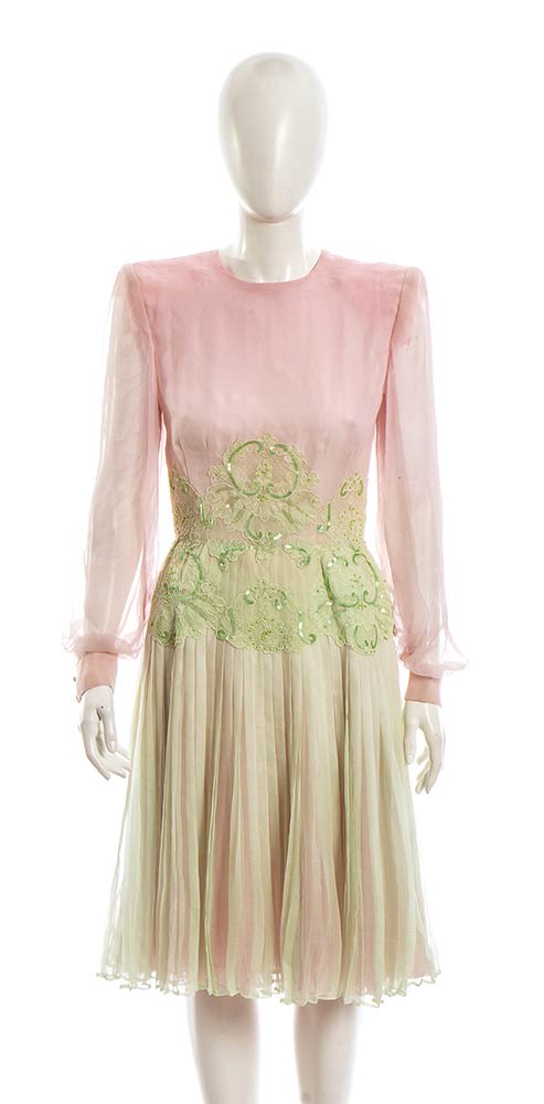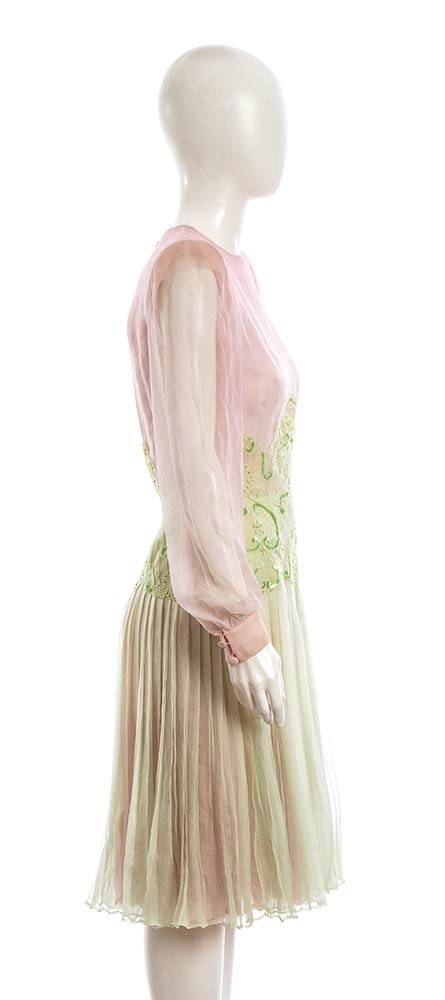 Abito Andrè Laug 1983 ca in seta rosa chiaro dettaglio in pizzo con ricamo di paillettes e perline, grado di condizione generale B