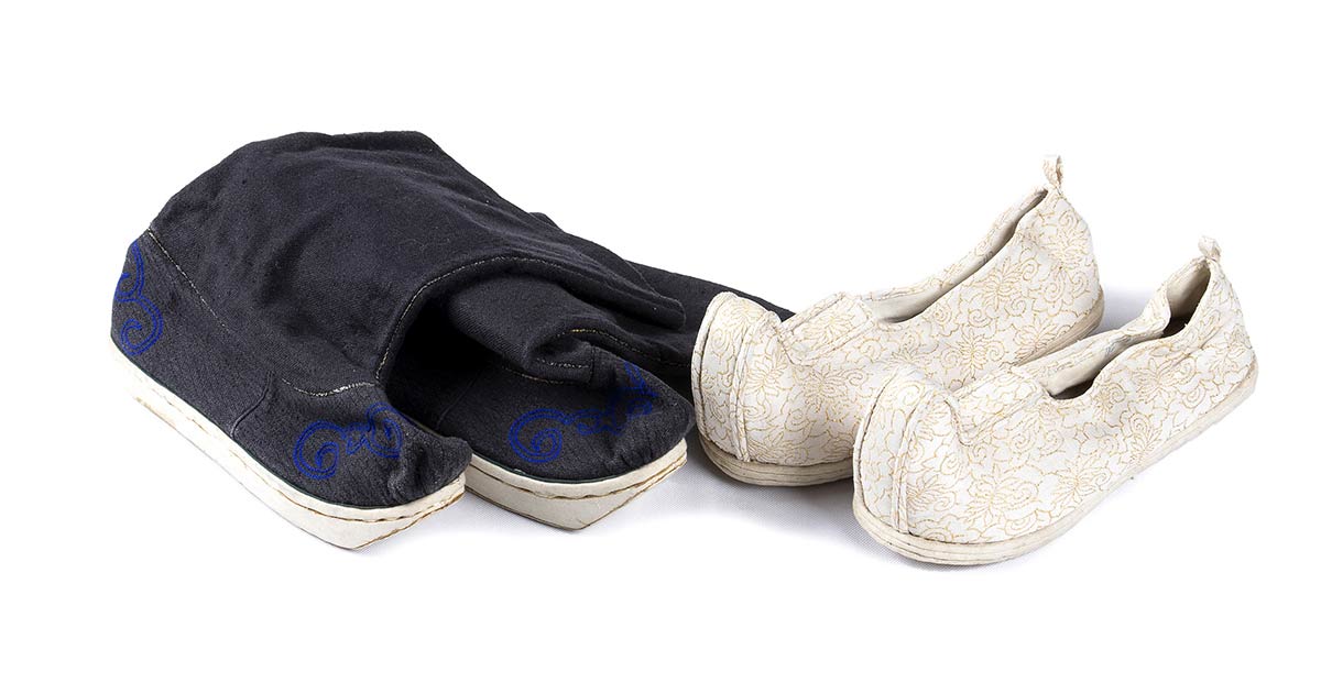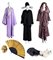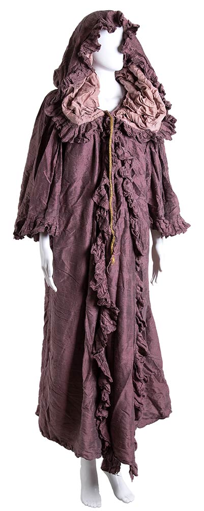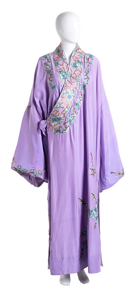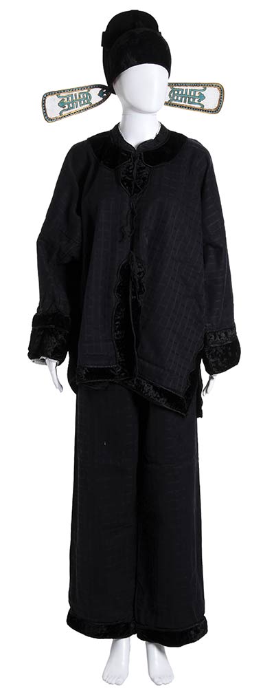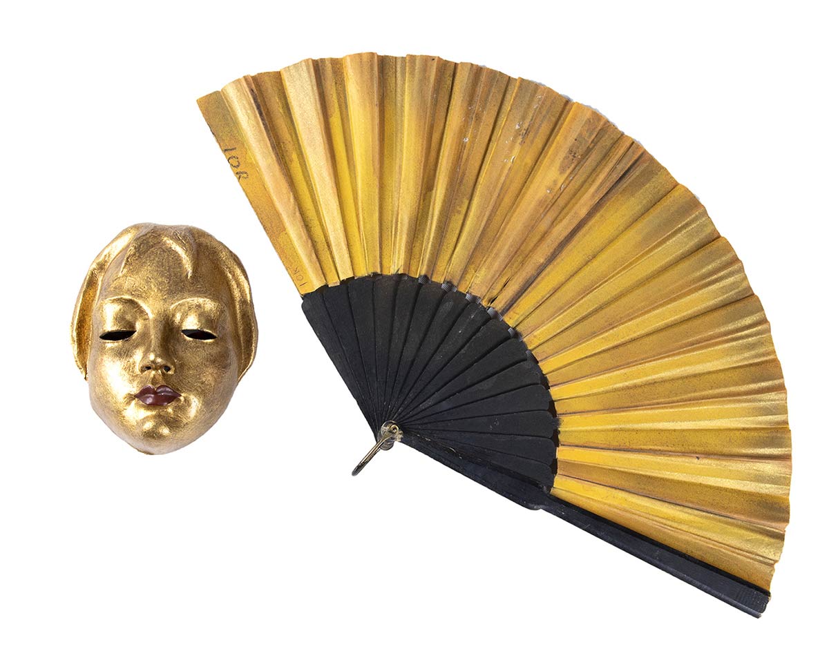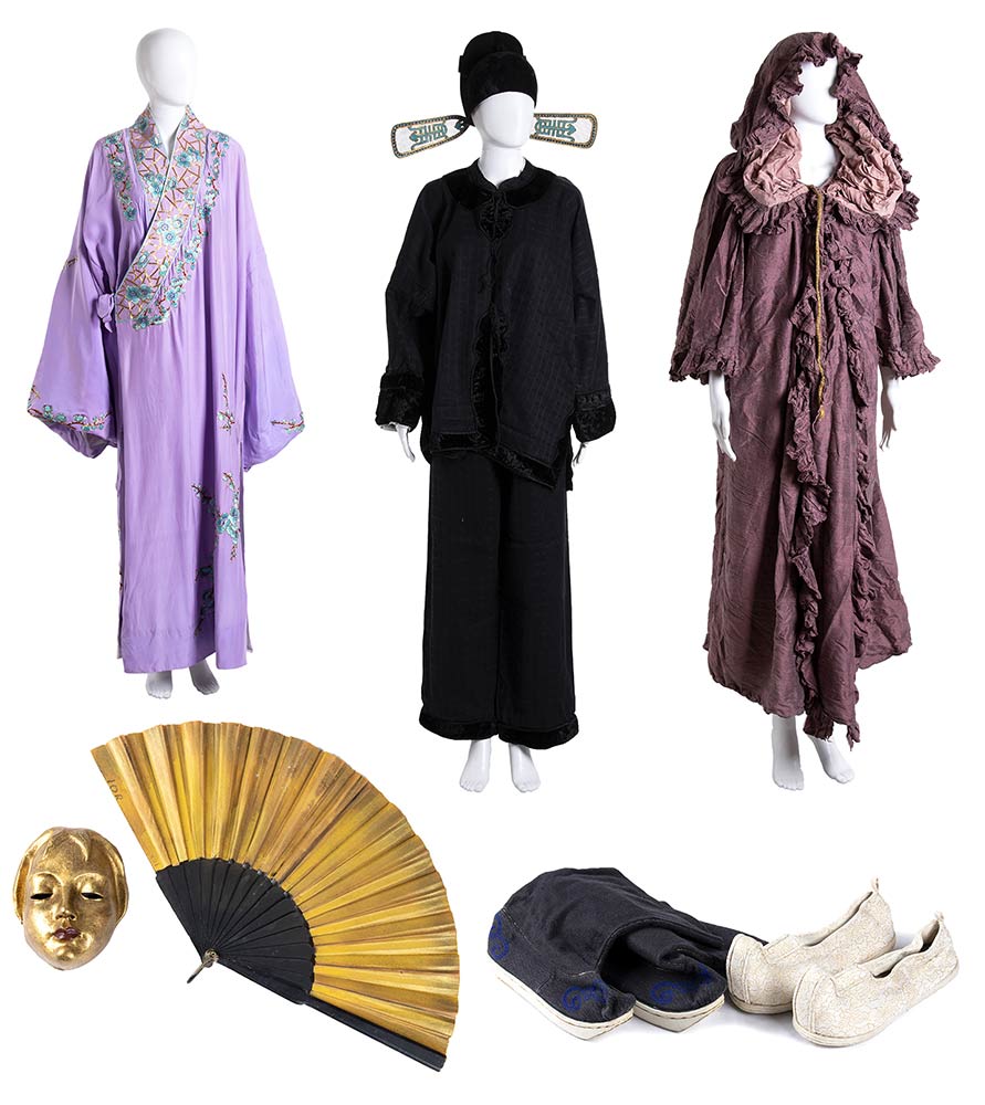 Set per il Teatro anni 90: mantello in seta cruda (GP11 sartoria), 1 maschera dorata, 1 completo maschile (giacca e pantalone) + copricapo, 2 paia di calzature, 1 kimono femminile in seta, un ventaglio in legno dorato, Grado di condizione generale B