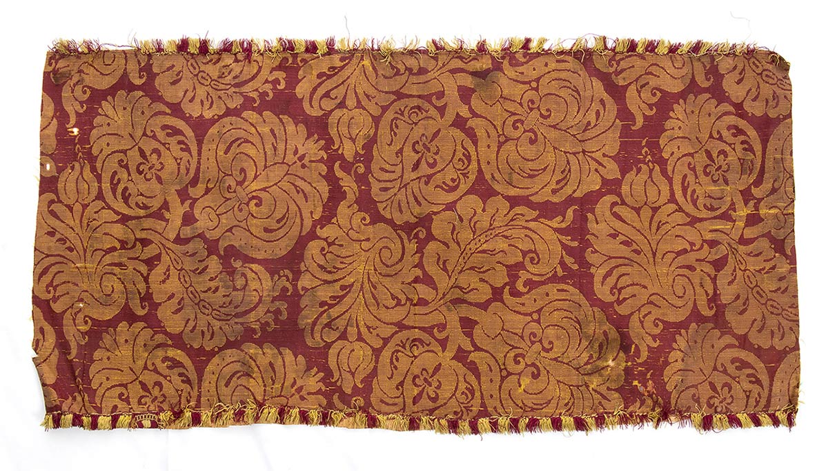 Frammento, manifattura italiana, seconda metà XVII secolo. Tessuto: damasco classico bicolore, fondo rosso disegno giallo ocra, il motivo è formato da da un tralcio con due infiorescenze contenenti un giglio stilizzato disposto in diagonale che si ripete in orizzontale.