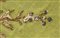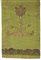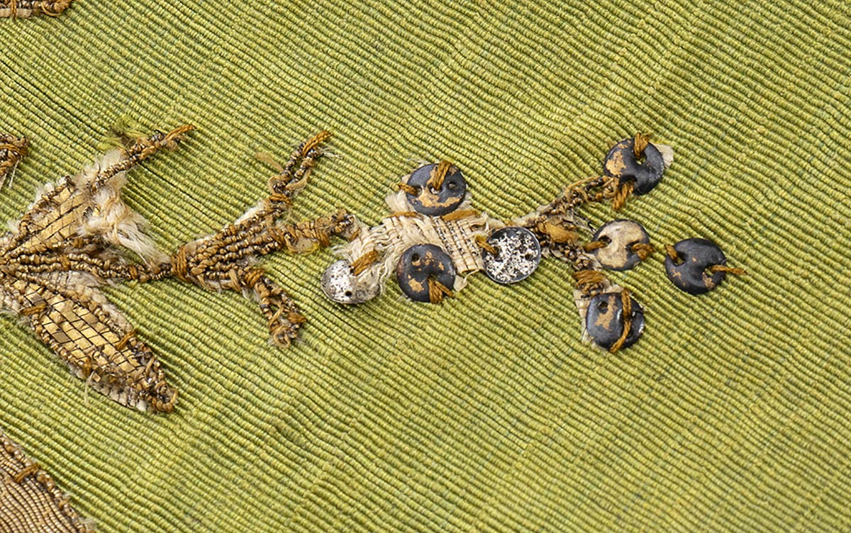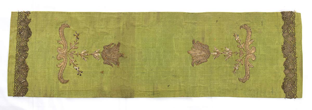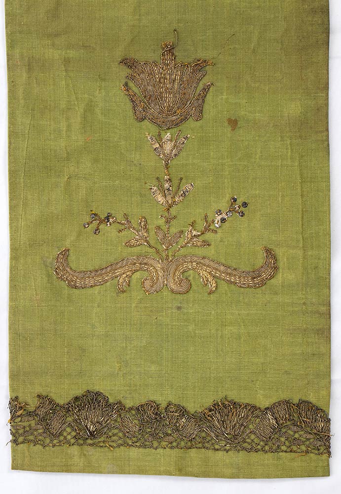 Striscia in tessuto, ricami con galloni in filo metallico, manifattura italiana, XIX secolo. Tessuto: moire in seta verde, ricami in filo metallico e paillettes, due racemi vegetali con fiore affrontati. Galloni sul lato corto: ventaglietti a fuselli semplici in filo metallico.