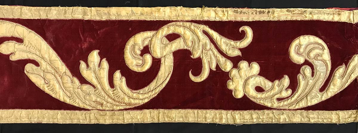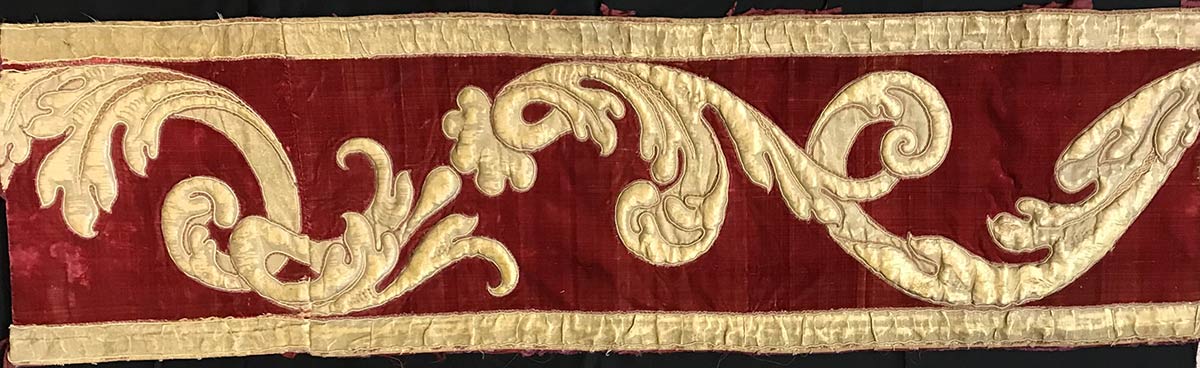 Due grandi balze ricamate, manifattura centro Italia sec XVIII secolo Tessuto: velluto in seta con ricamo imbottito in filato oro. Disegno: tralci vegetali ricamati in oro su un velluto liscio, di colore rosso.