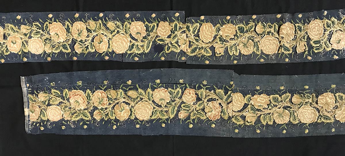 Grande metratura di piccola balza in tappezzeria, XVIII century. Tessuto: punto arazzo su supporto di panno. Disegno: su di un tronco ritorto si alternano e ribaltano piccole foglie e bocci di fiori.In origine strisce di arazzo potevano fare parte di una bordura, successivamente sono state applicate su di un panno di colore blu.