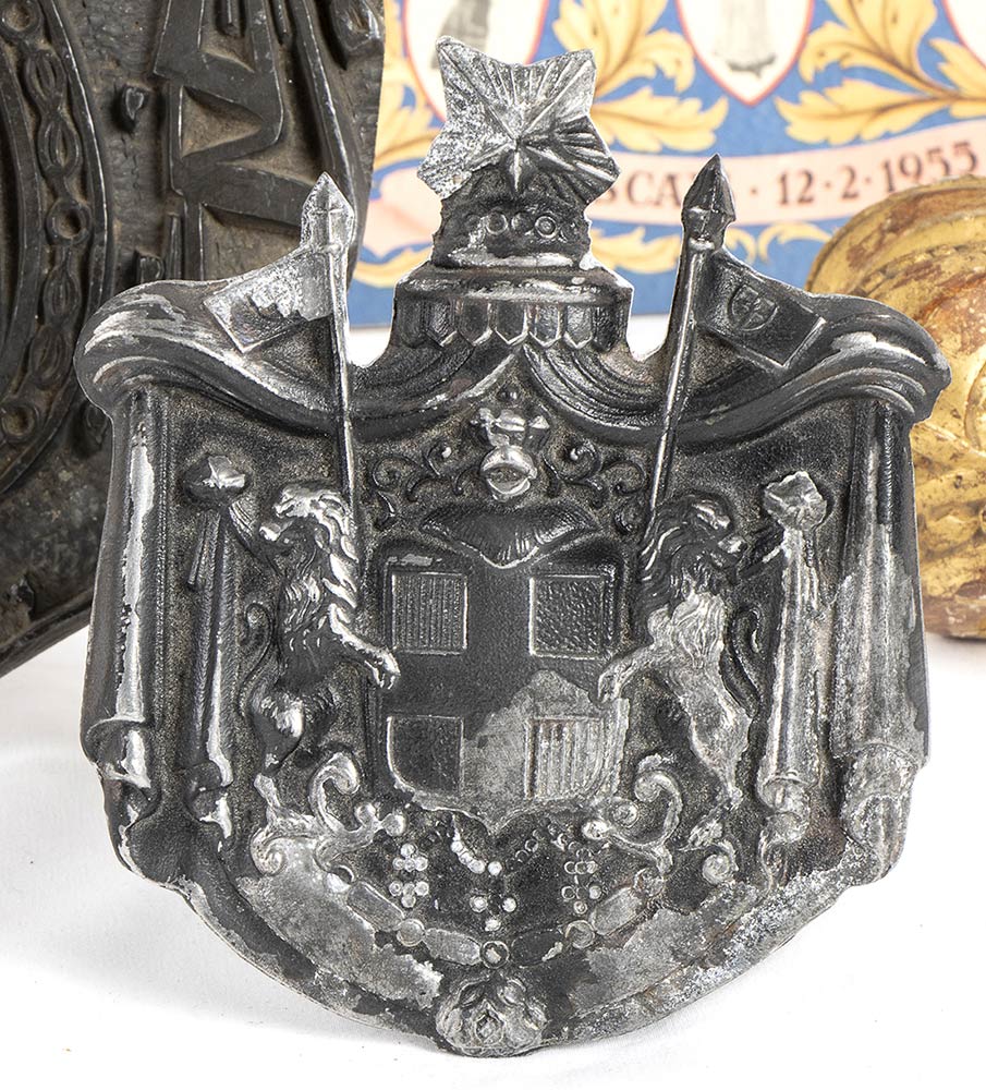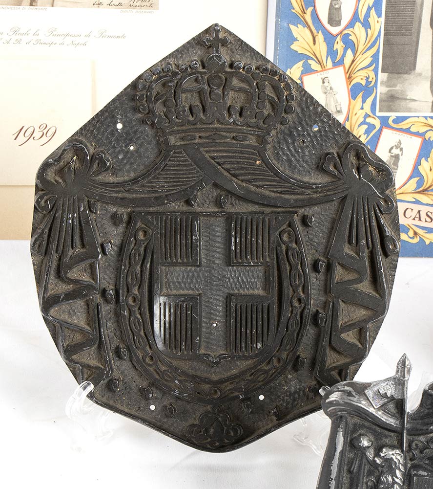 Lotto di cimeli savoia, uno scudo con corona reale in legno dorato, due fregi in metallo, un calendarietto del 1939 applicato su cartoncino con foto di Maria Jose realizzata e firmata da Ghitta Carrel, fotografa ufficialmente accreditata a casa reale e dal Duce, ed una pubblicazione illustrata di 67 pagine, con foto e racconti a ricordo dell'evento di Cascais, le nozze di Maria Pia di Savoia (figlia del re Umberto II) con Alessandro di Jugoslavia (Cascais 12-02-1955 redatta da Cesare Marchetti di Muriaglio e Giulio Solci Scarpi. Buone condizioni , misure del calendario cm.38x25, rivista cm.34x24, cimeli dai cm.13 ai cm.23