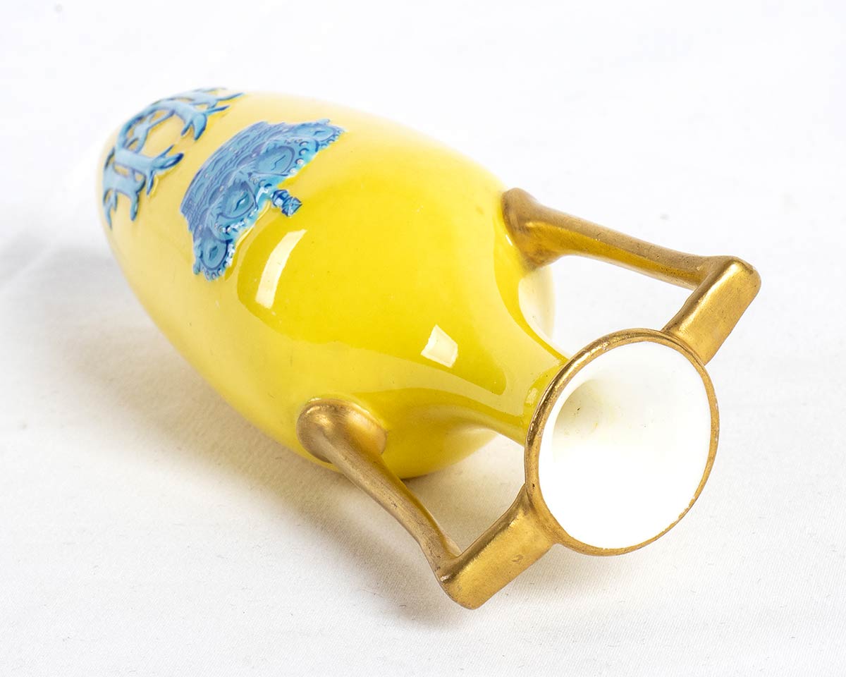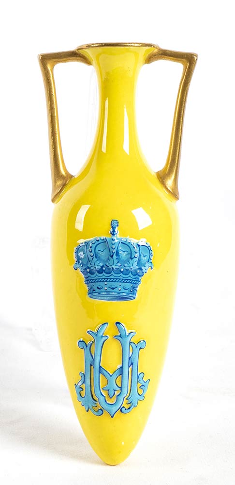 Rara bomboniera celebrativa per le nozze reali di UMBERTO I di Savoia, Re d'Italia, e MARGHERITA, avvenute il 22 Aprile 1868. Realizzata in ceramica, dai bei colori giallo e blu, con profilature oro ed interno bianco. Originale del 1868, in perfette condizioni, misura cm.14