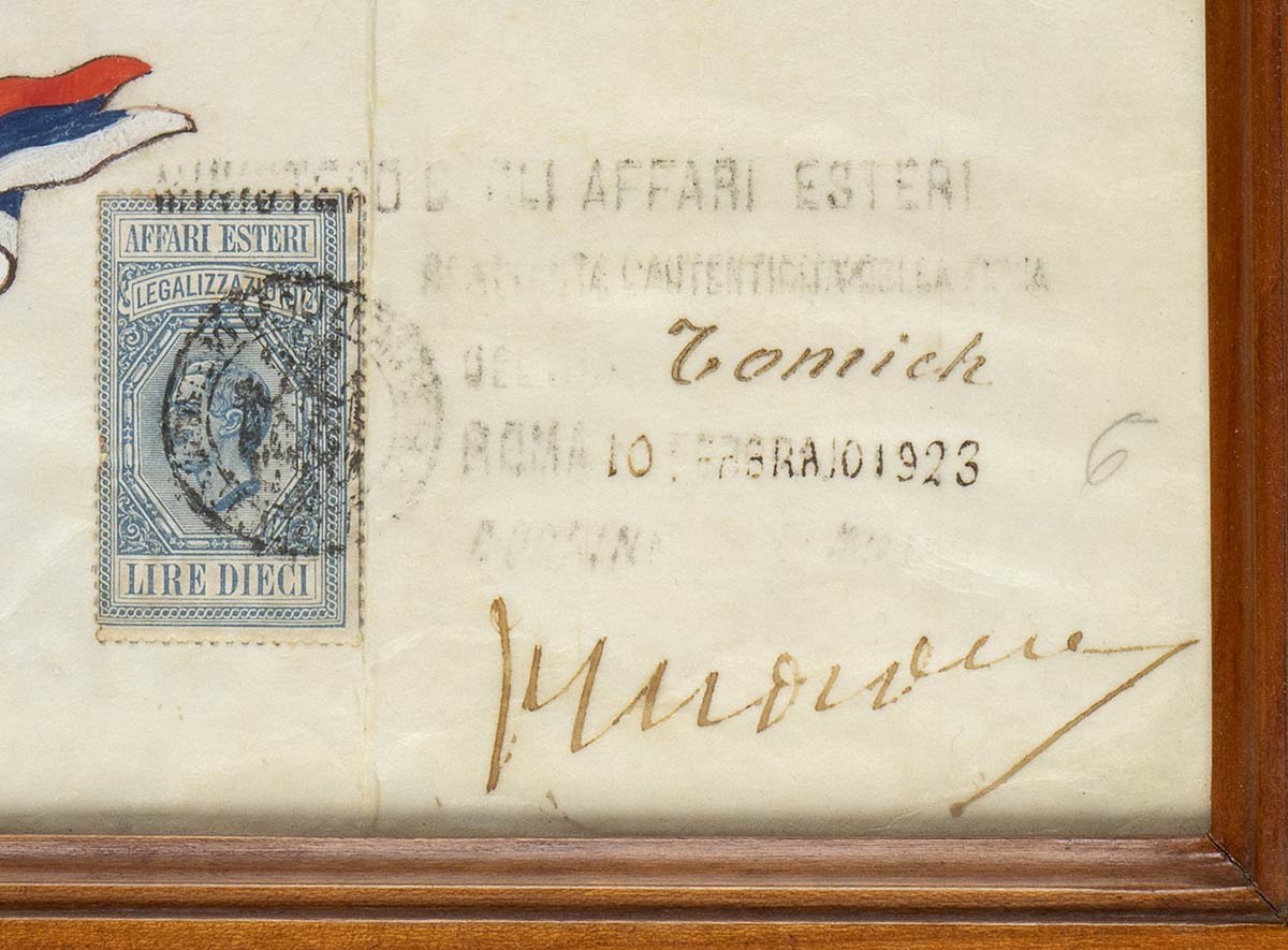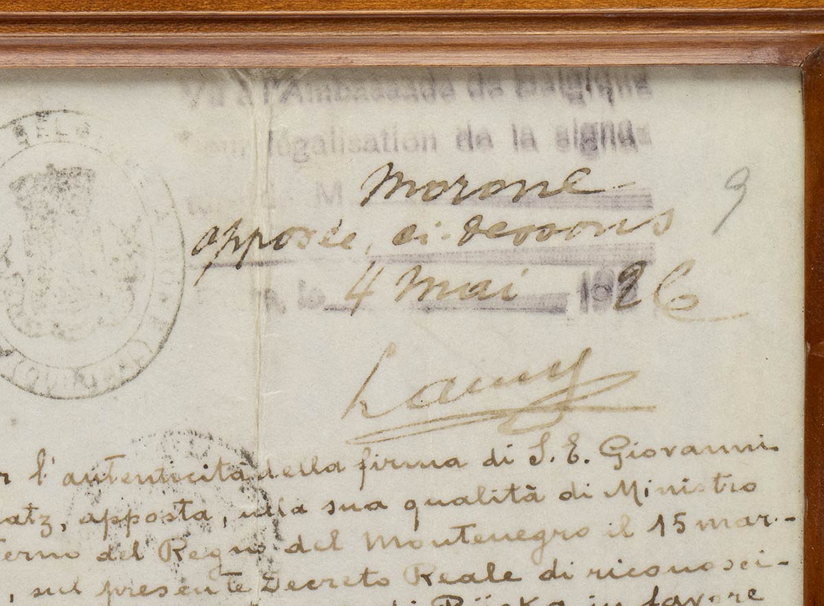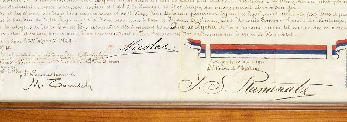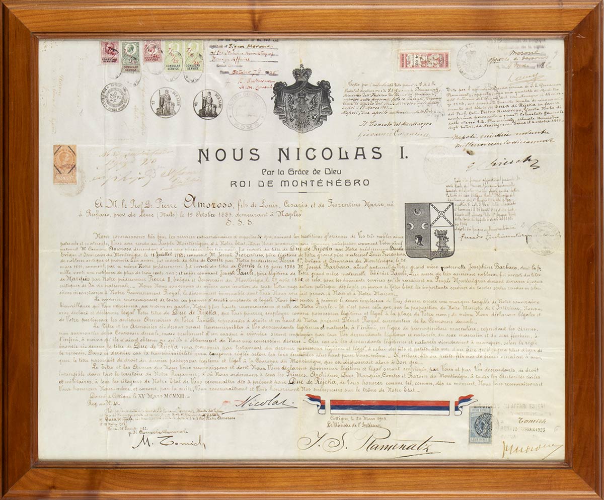 Attestato su carta pergamena, redatto a mano a Cettigne e datato 15 Marzo 1913, per il riconoscimento del titolo nobiliare di Duca di Rijeka a Pietro Amoroso. Firmato autografo da NICOLA I Re del Montenegro, con firma apposta in basso al centro dell'attestato. Titolo riconosciuto valido e controfirmato dal console generale TOMICH il 25 Settembre 1922. Bolli di rinnovi successivi. In ottime condizioni, misura circa cm.54x43 all'interno di cornice di cm.62x51