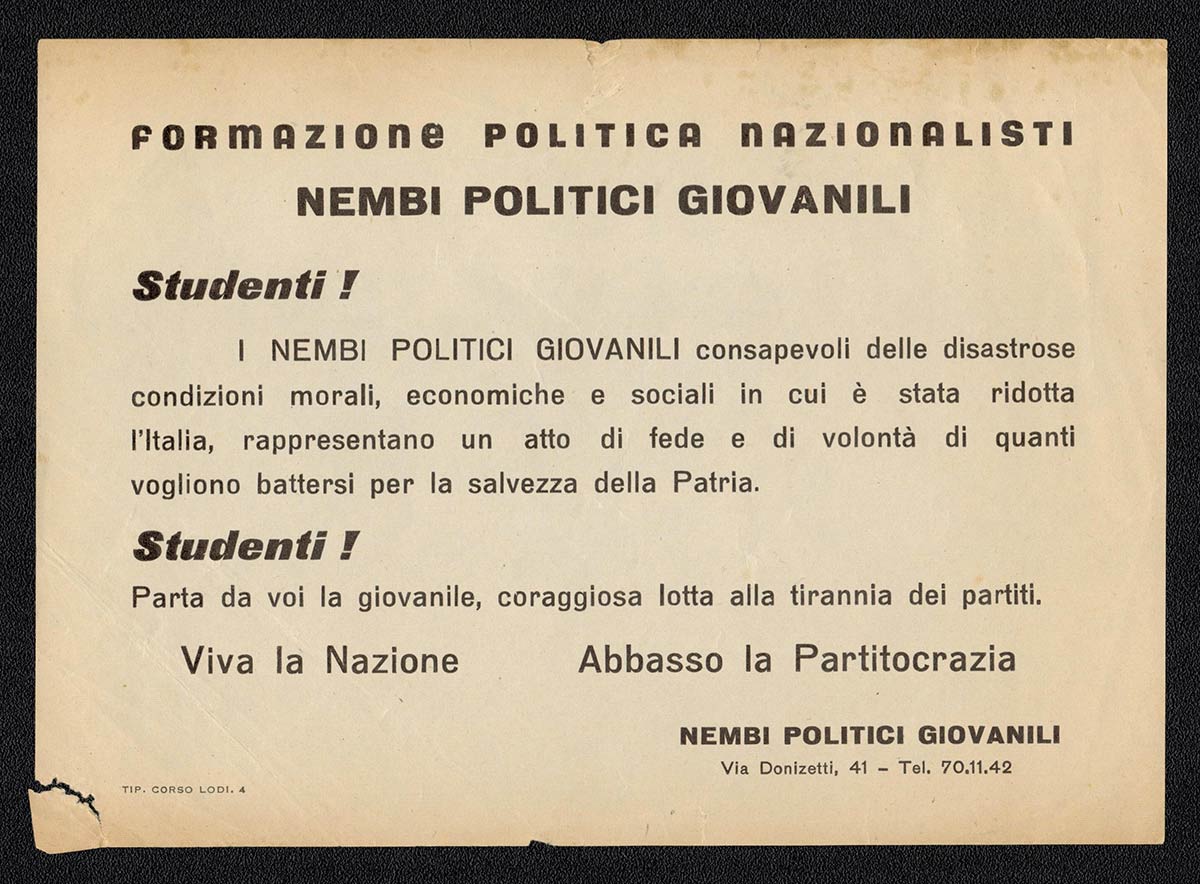 la Formazione Politica Nazionalista dei Nembi Politici Giovanili si rivolge ancora una volta agli studenti, incitandoli ad appoggiare la lotta per la salvezza della Patria dalla partitocrazia. Misura cm. 17,6 x 12,5 ed è in buono stato, con lievi pieghe sparse, un punto metallico in alto a sinistra