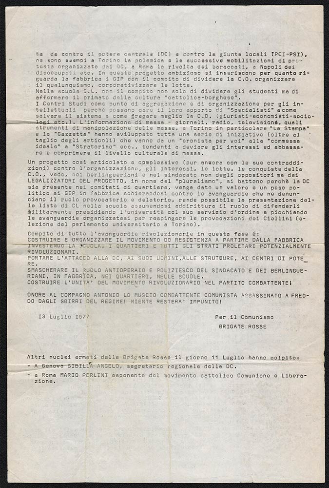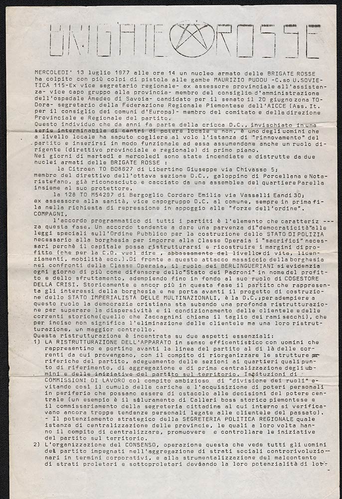 Volantino delle Brigate Rosse che rivendicano l'attentato a Maurizio Puddu, avvenuto il 13 Luglio 1977 alle ore 14 in C.so Unione Sovietica a Torino. Nel rincasare dopo una riunione politica, Puddu fu vittima di un agguato compiuto da Nadia Ponti, Lorenzo Betassa e Dante Di Blasi (operaio della Fiat) e raggiunto da quattordici proiettili, di cui sette all'addome.