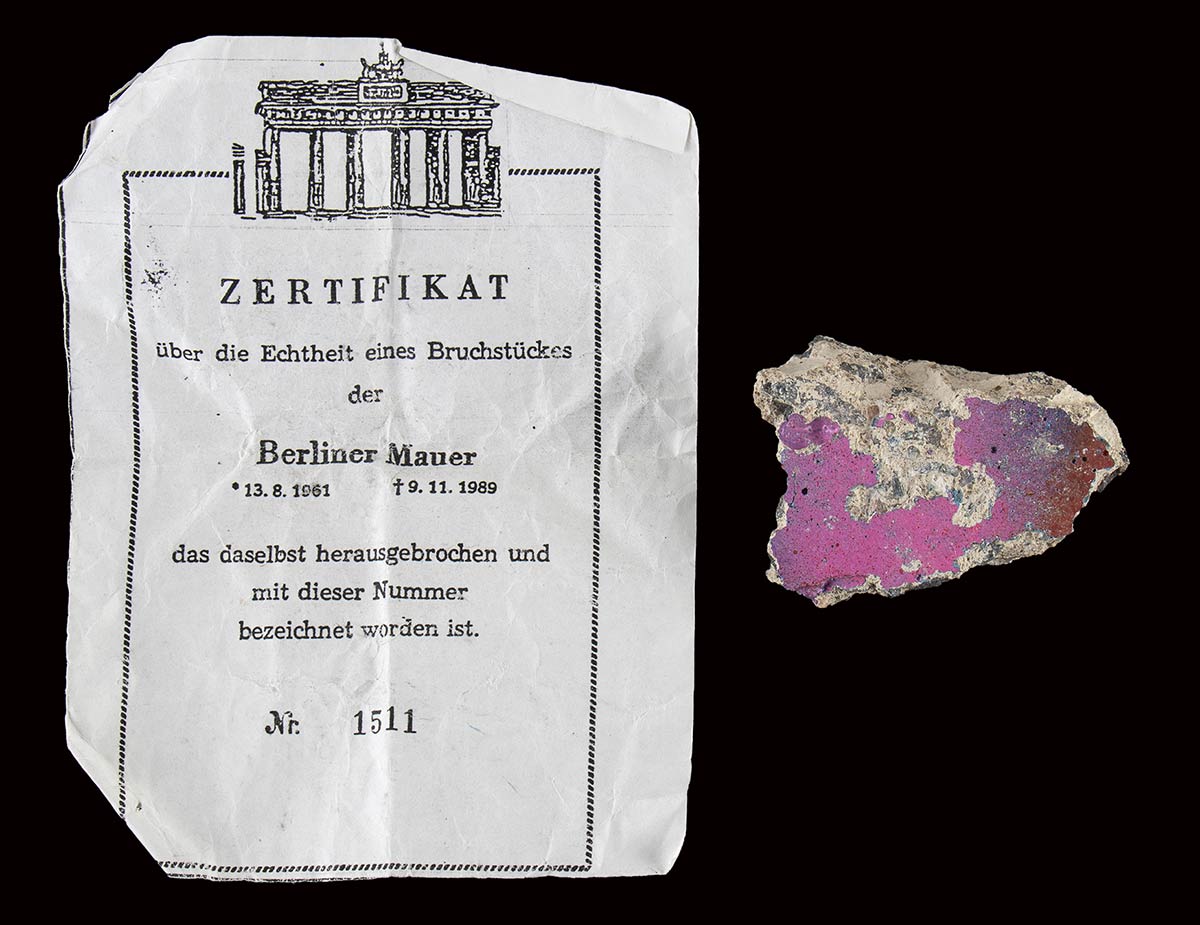 Importante cimelio di un evento memorabile, storico, la caduta del muro di Berlino. Frammento originale del muro con tracce di colorazione varia dovuta ai graffiti ed alle scritte eseguite sul muro, accompagnato dal suo certificato di autenticità "ZERTIFIKAT Uber die Echtheit eines Bruckstuckes der BERLINER MAUER - 13.8.1961 - 9.11.1989 - das daselbst herausgebrochen und mit dieser Nummer bezeichnet worden ist. NR.1511" Il muro fu abbattuto nel Novembre del 1989. Misure cm. 6x4