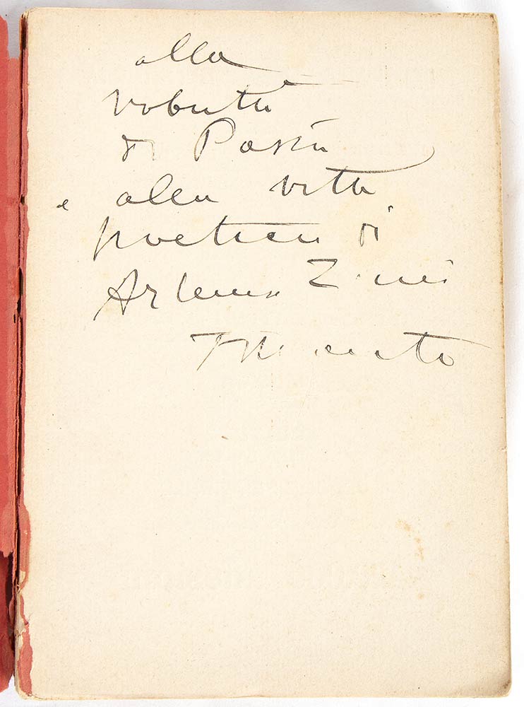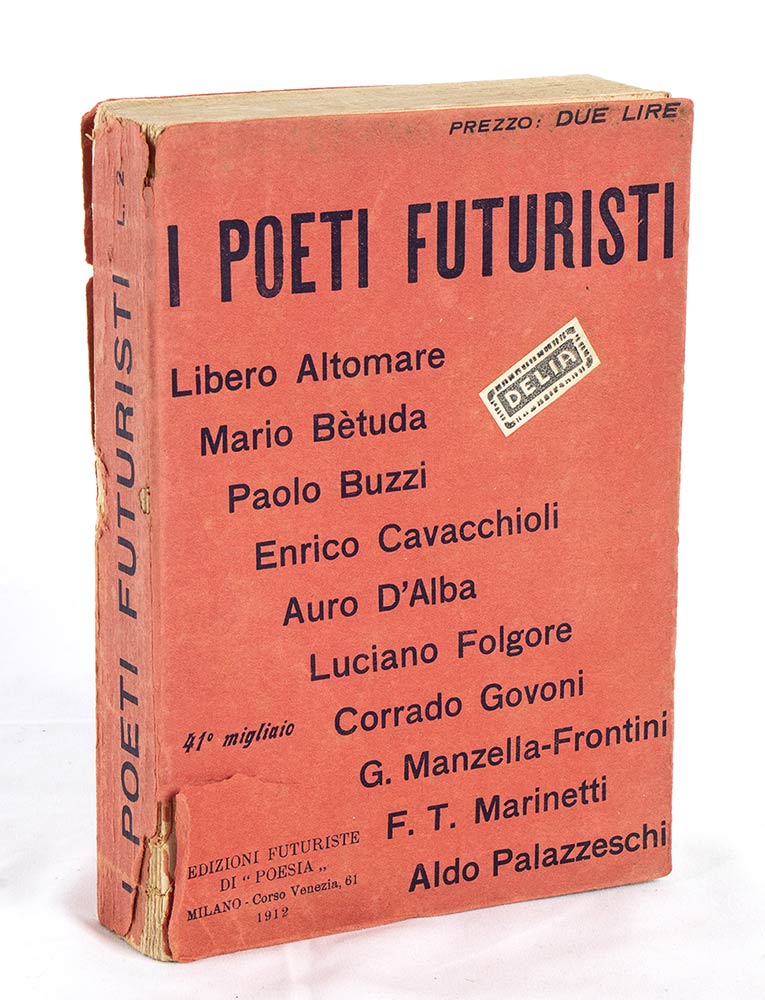 Volume I POETI FUTURISTI con dedica ad Artemisia Zimei e firma originale autografa di Filippo Tommaso Marinetti. Antologia di poeti futuristi, Libero Altomare, Paolo Buzzi, Auro d'Alba, Luciano Folgore, Marinetti ed altri. Edizioni futuriste di "Poesia" - Milano, Corso Venezia 61, 1912. In 8°, pag.428, brossura rossa editoriale, stampata in nero, cm.14x20, strappo e targhetta exlibris applicata in prima di copertina, danni al dorso e strappo alla quarta di copertina, interno in buone condizioni.