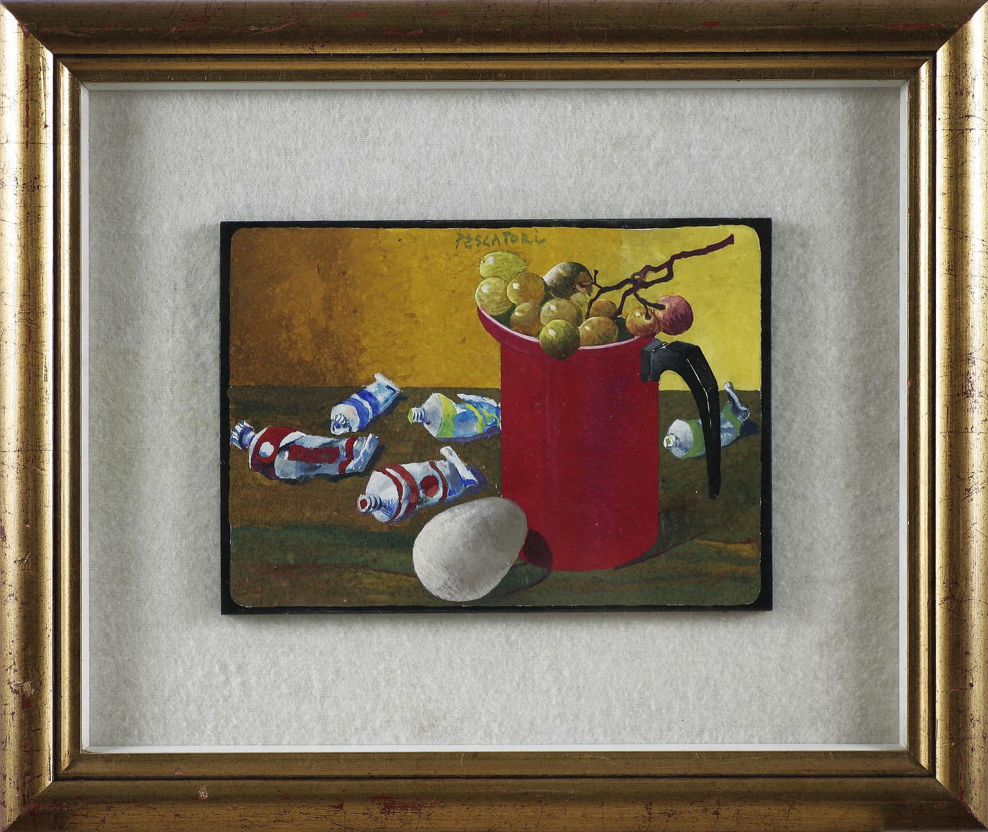 PESCATORI CARLO (n. 1932) Natura morta. Olio su tavola. Cm 27,00 x 19,00. Firma in alto. Cornice presente