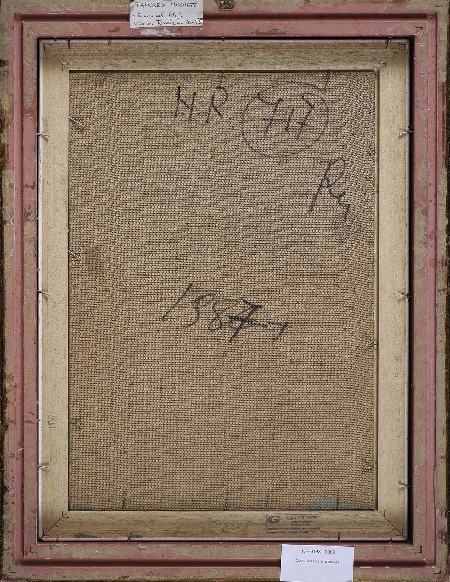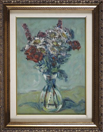 MUCHETTI TANCREDI (n. 1932) Vaso di fiori. 1987. Olio su tavola. Cm 30,00 x 42,00. Firma in basso a sinistra. Al retro data. Cornice presente