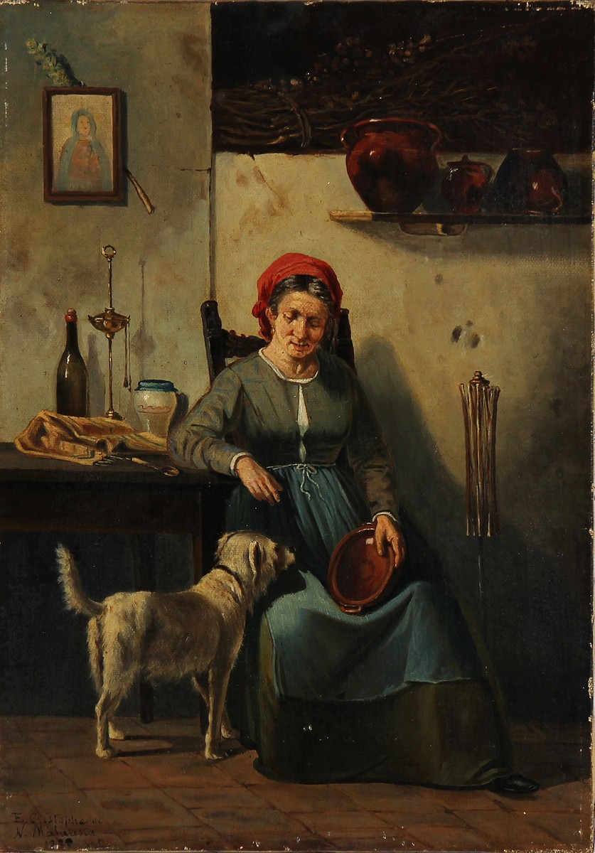 ANONIMO Donna anziana con cane in un interno. 1889. Olio su tela . Cm 33,00 x 46,50. Firmato N. Malatesta e data in basso a sinistra. Cornice presente