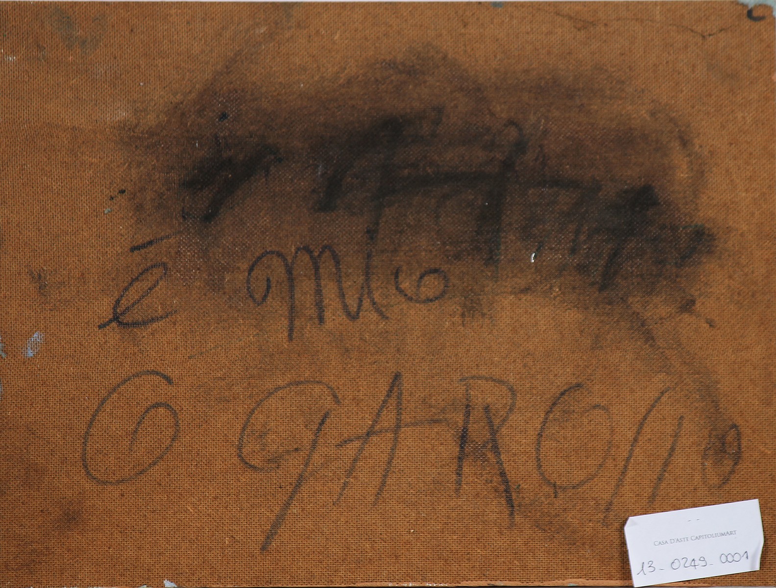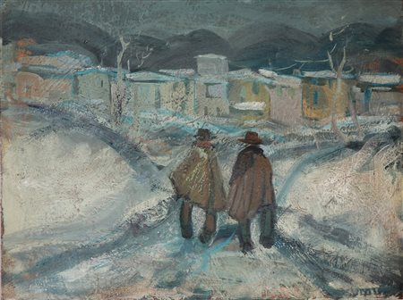 GAROSIO OTTORINO (1904 - 1980) Viandanti in un paesaggio innevato. Tecnica mista su faesite. Cm 40,00 x 30,00. Al retro firma per autentica dell'artista.