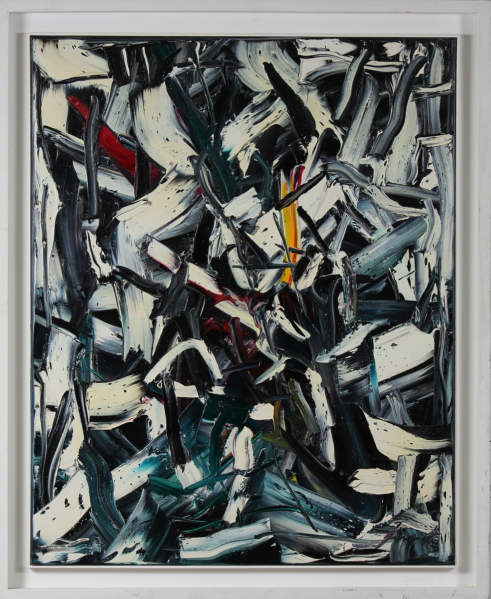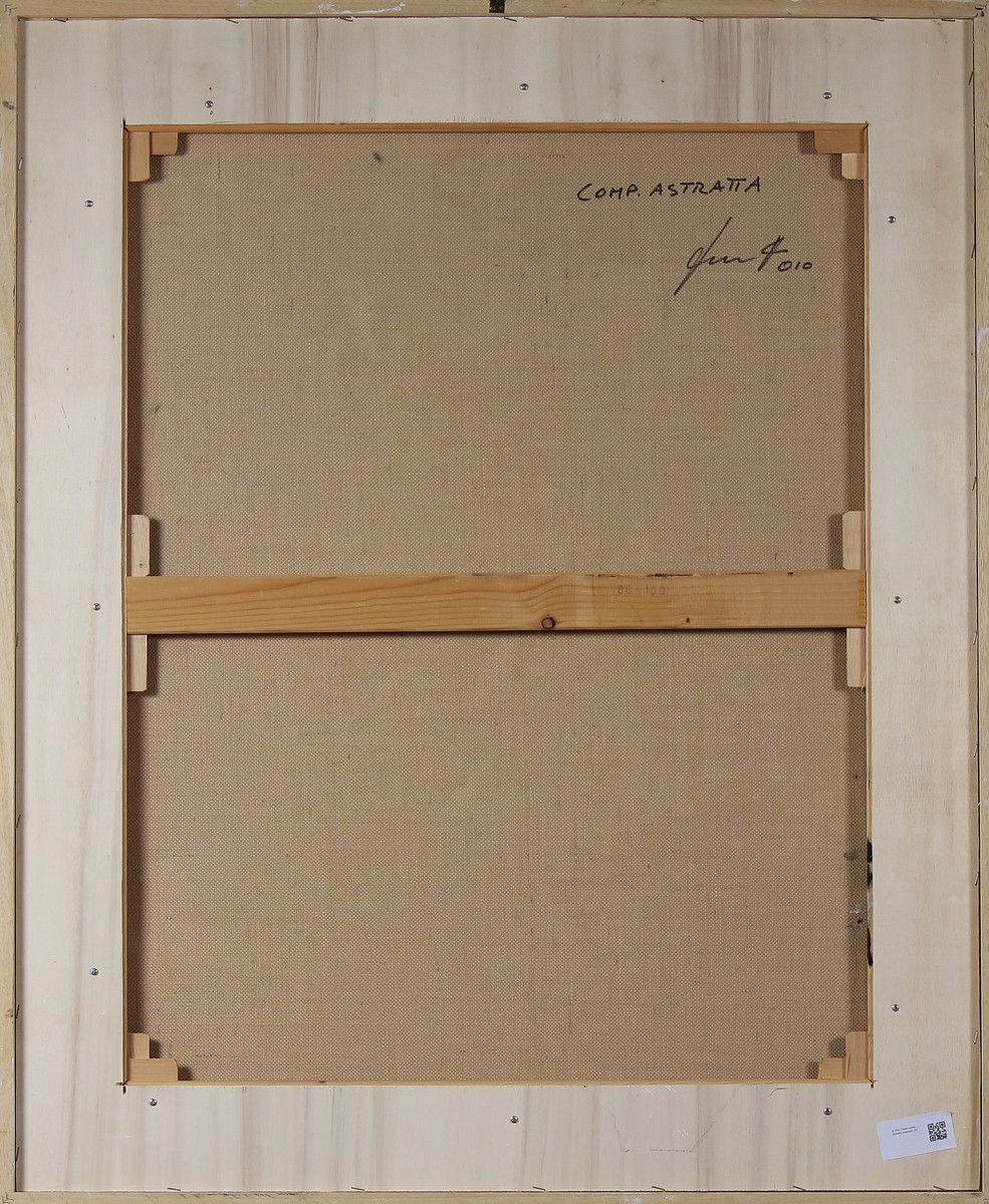DE LUTTI PIERLUIGI (n. 1959) Composizione astratta. 2010. Olio su tela . Cm 80,00 x 100,00. Firma in basso a destra. Al retro firma, titolo e data. Certificato di provenienza a cura della Galleria Allegrini arte contemporanea, Brescia. Cornice presente