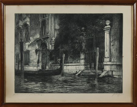 ANONIMO Giardino nel canal Grande. Acquaforte. Cm 78,00 x 60,00. Monogramma GB in basso a destra. Titolo e firma - Balassino - in basso a matita. Cornice presente
